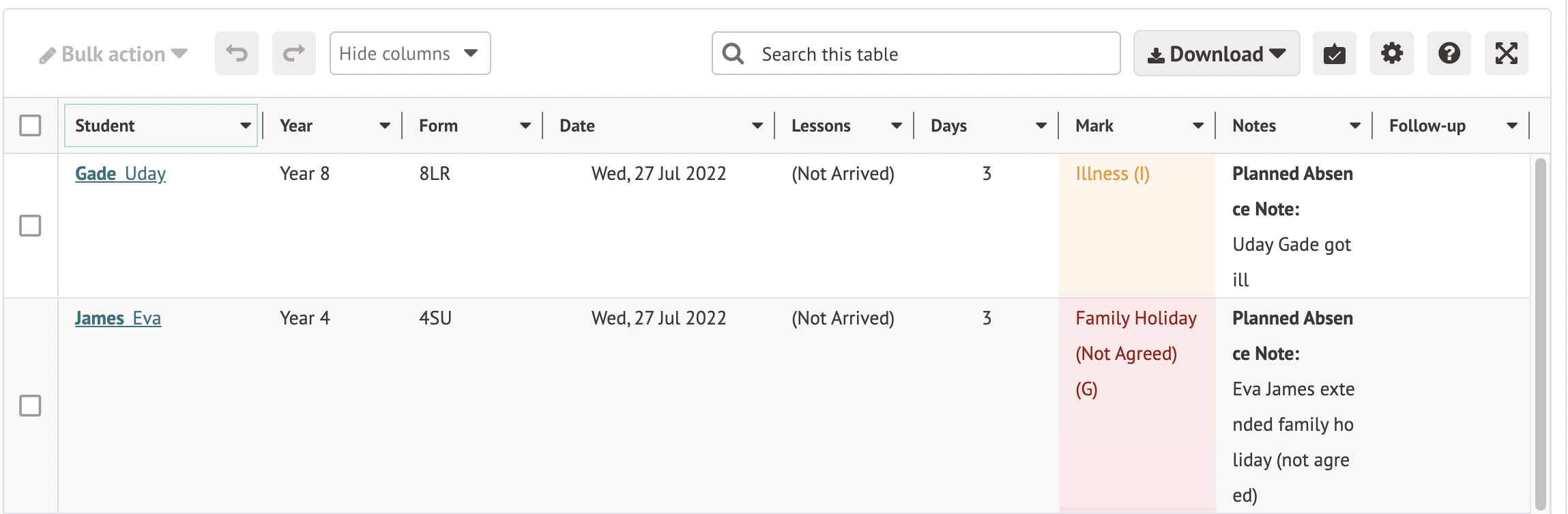 You may want to find out if a student who is absent today was absent yesterday (or for several days in a row).