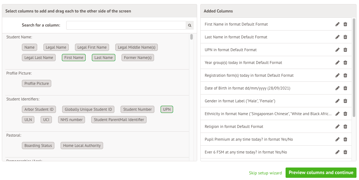 Select the date range to include students from, then check the report columns. If you don't want to add any further columns, click Skip setup Wizard.