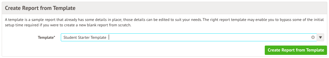 Go to School > Custom Report Writer and click to create a new report. Click the drop-down list to select the Student Starter Template report template, then click the Create Report from Template button.