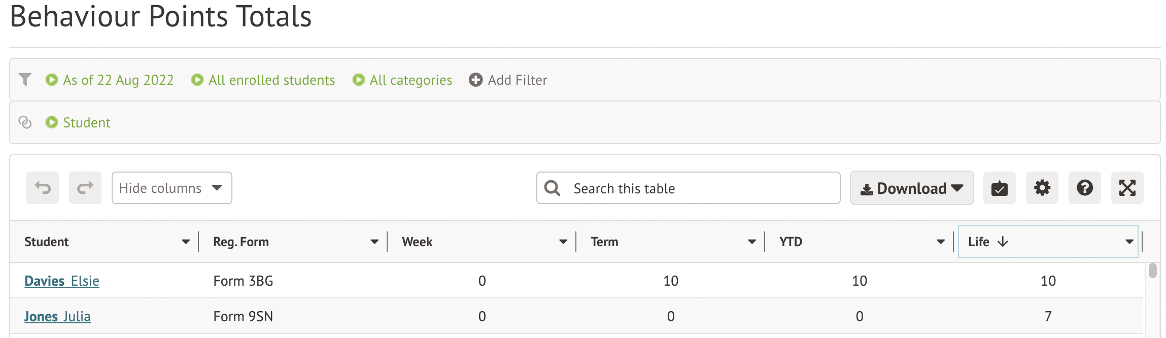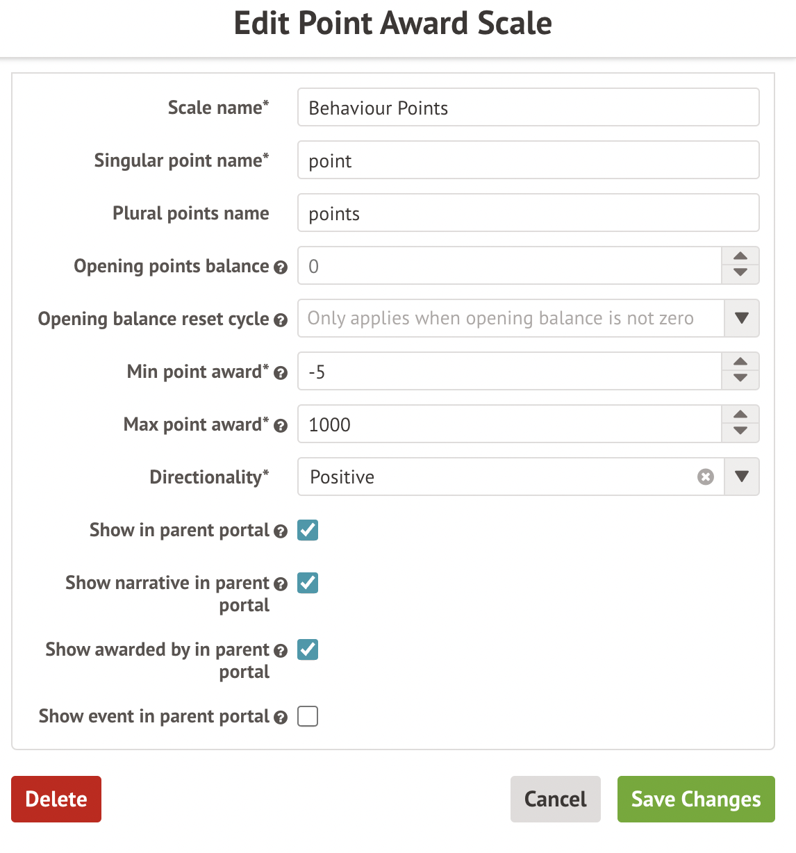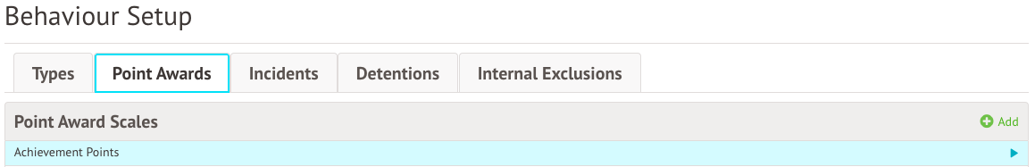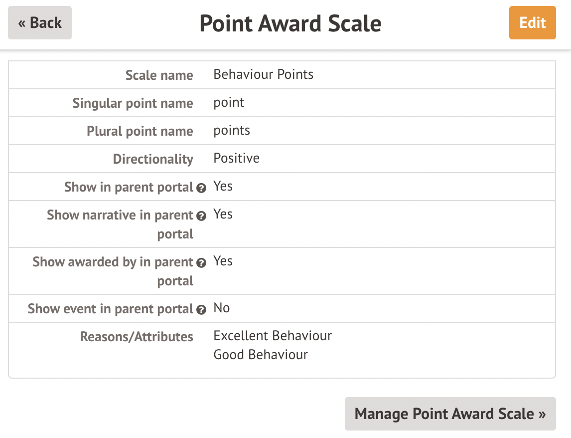 To view your settings, go to Students > Behaviour > Setup > Point Awards tab, select your scale, and click Edit.