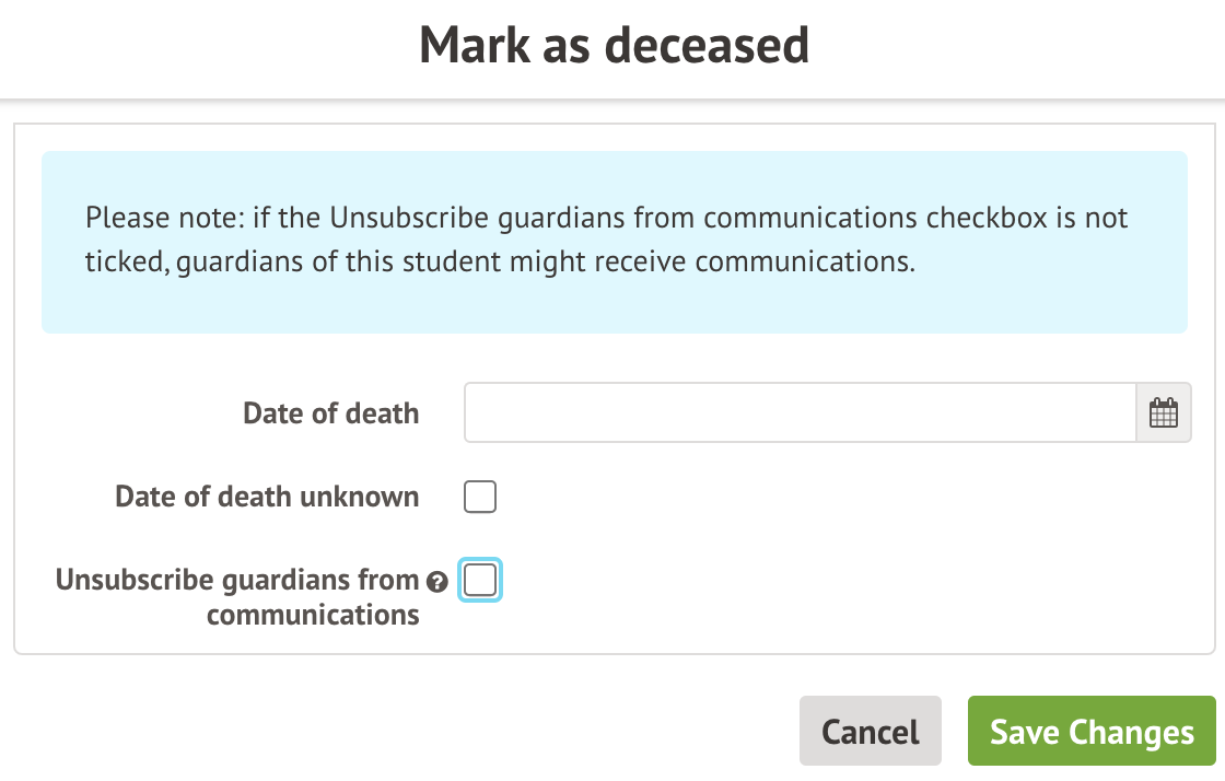 Select whether to unsubscribe the student's guardians from communications relating to that child.