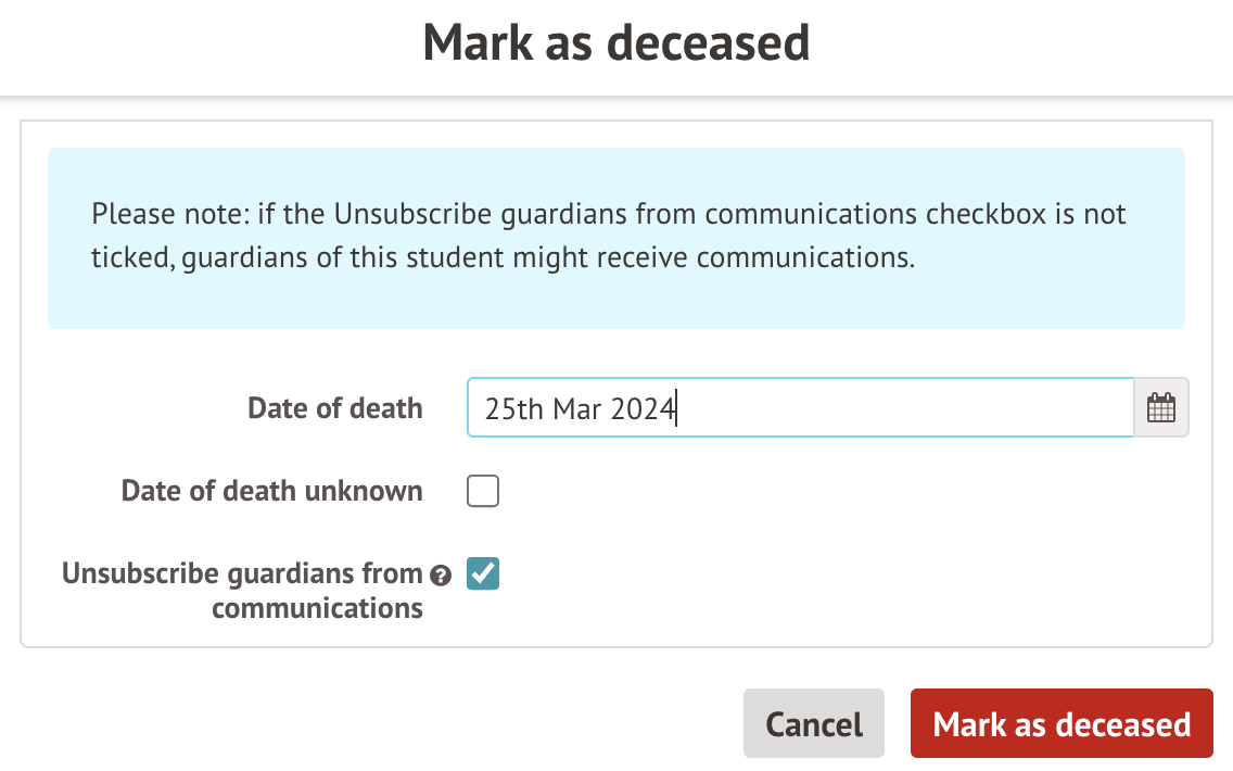 Please note that marking someone as deceased will not remove them from your school. You would also need to take further actions:
