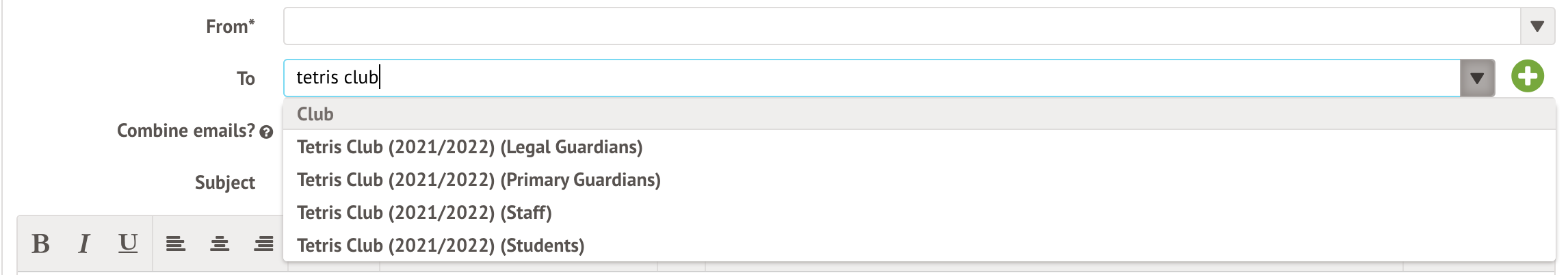 To communicate with Club Participants for a specific club session (excluding students who are no longer attending), please see Emailing Guardians from a Club.