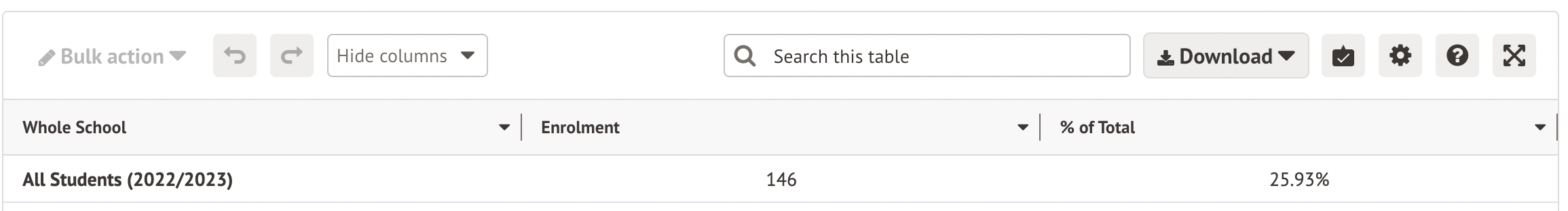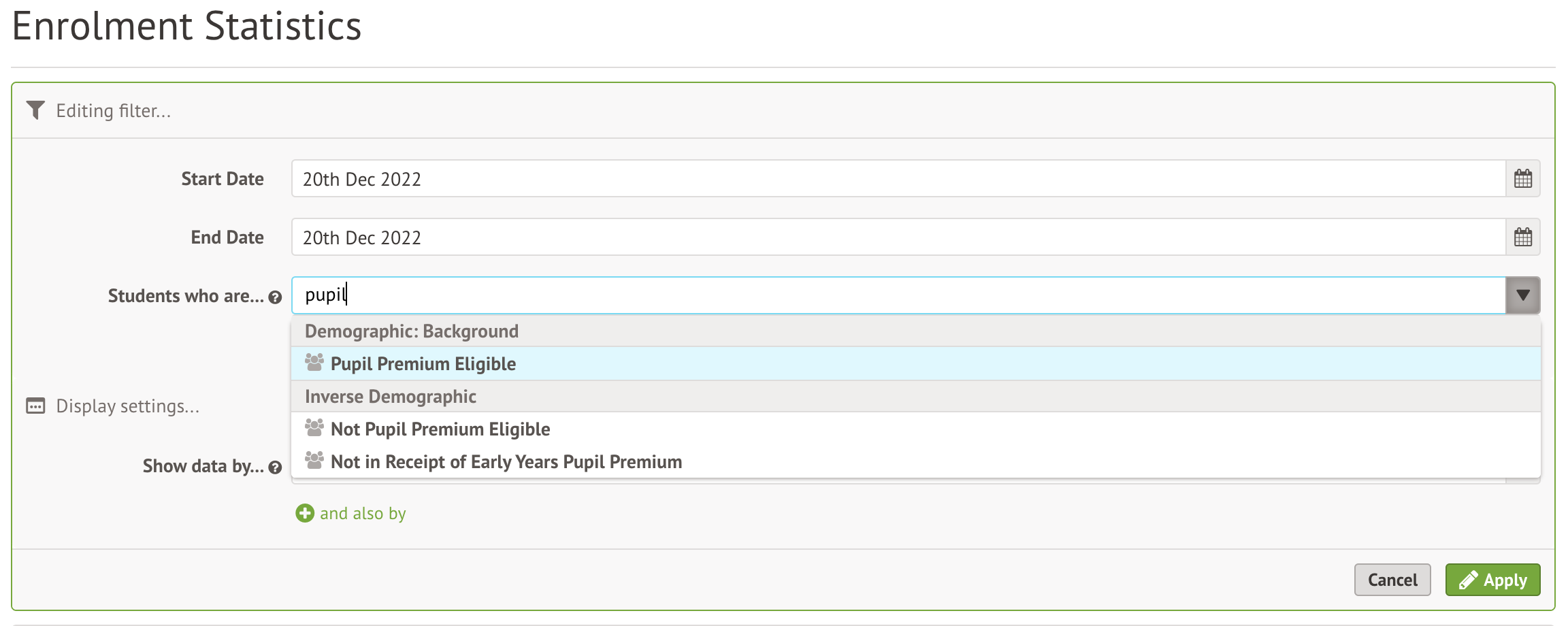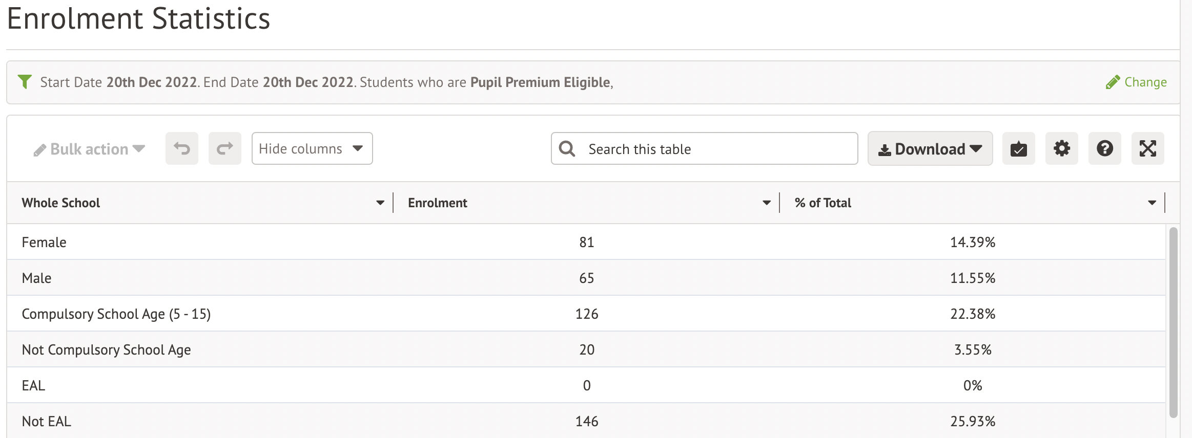 The easiest way of seeing what percentage of your cohort are Pupil Premium, or other demographics, is to go to Students > Enrolment > Statistics. Click into the filters, and select to show students who are Pupil Premium then click Apply.
