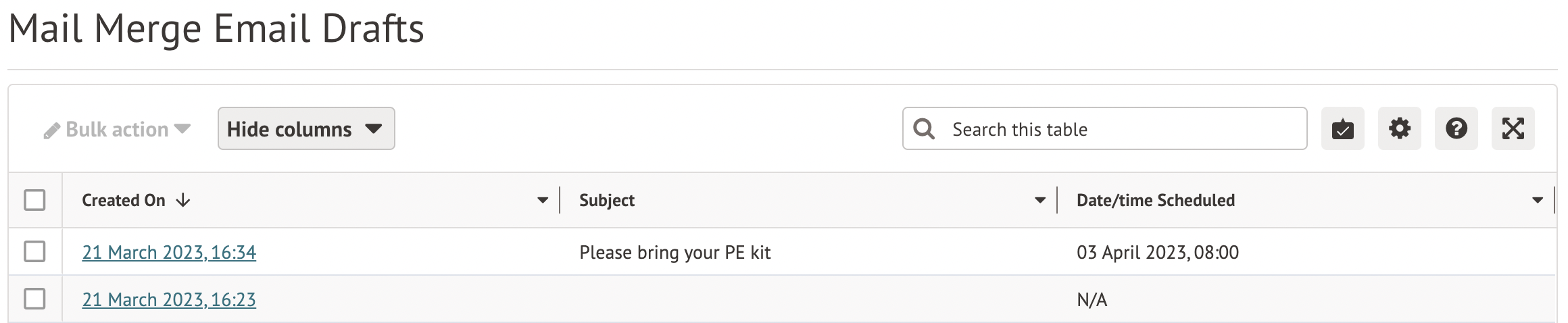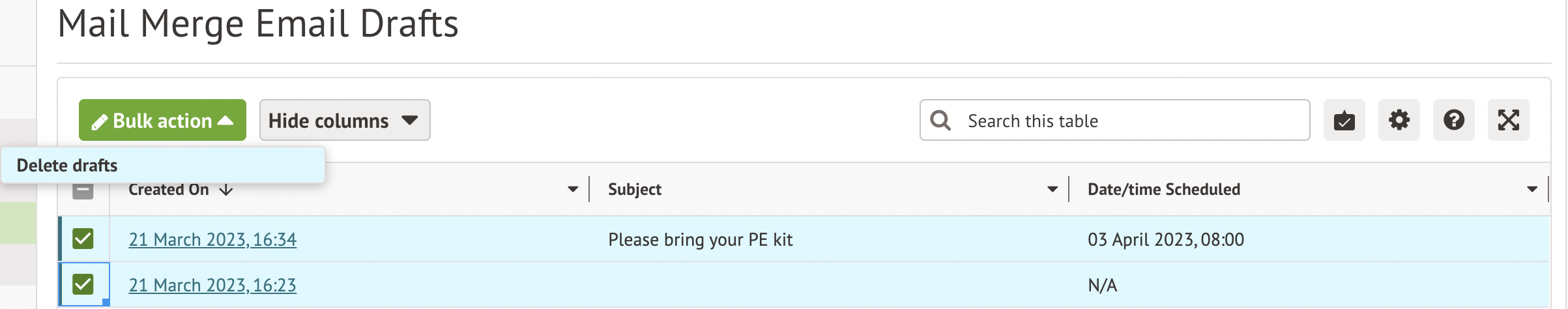 If you've accidentally created a draft by visiting the New Mail Merge page, or want to delete a draft if it is no longer needed, just go to the drafts page for the communication type.