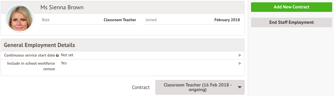 To add a document for a staff member's training, go to the staff member's profile. Click into the Contracts section from the left-hand menu, and make sure the right contract is selected.