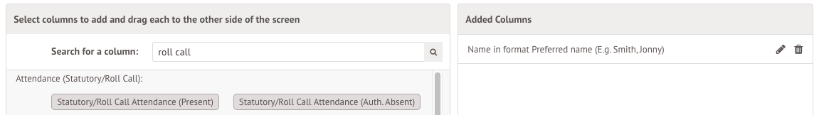 When you get to the Columns step, add the Statutory/Roll Call Attendance (Present) field to the right-hand column.