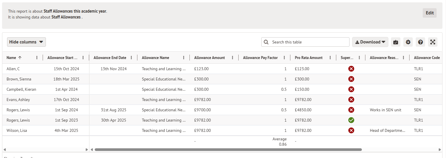 You can see a report of all staff added to an allowance once you select an allowance type from the School > All Staff > HR Admin > Allowances page.
