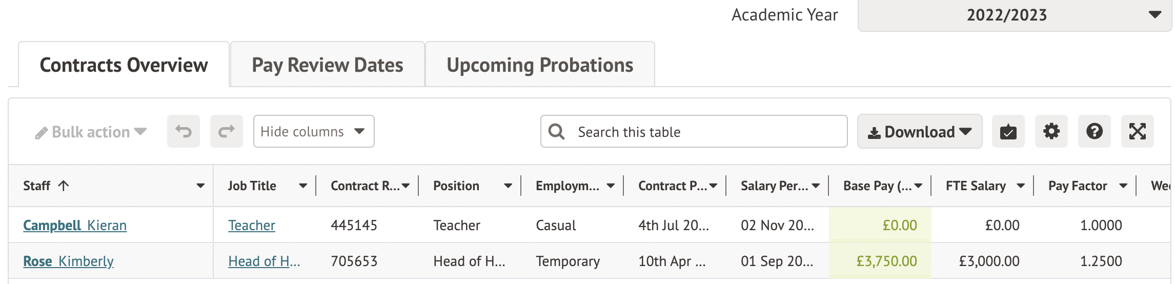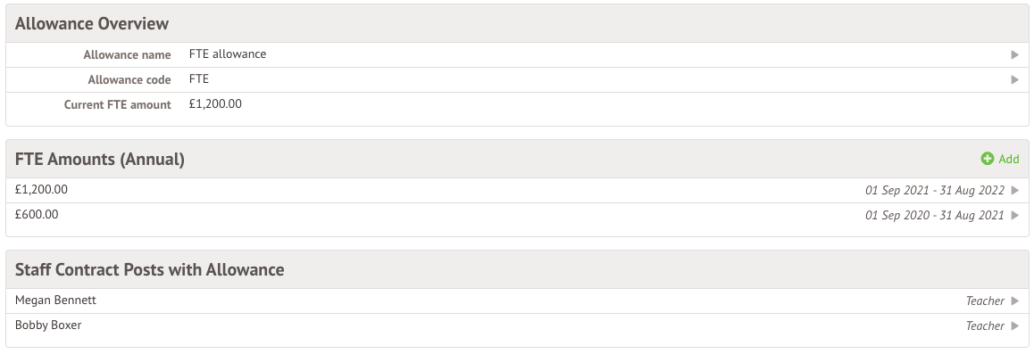 You can also see the total amount for allowances added to each contract from the School > All Staff > HR Admin > Contracts page.