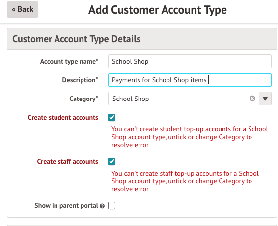 - Make sure you select the Category of School Shop. This means that parents can't top up the account, but they will be able to purchase the items.