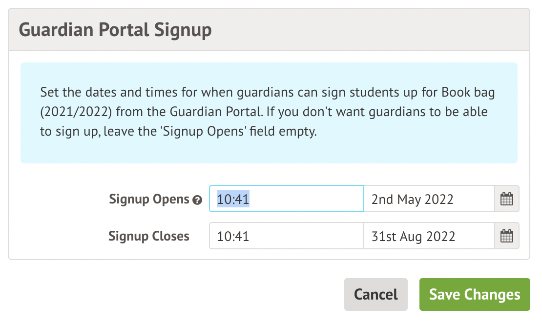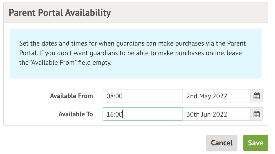 Use the Parent Portal Availability section to choose when this item is purchasable through the Parent Portal and Parent App. Leave these times and dates blank to manage purchases manually, and not show these on the Parent Portal and Parent App.
