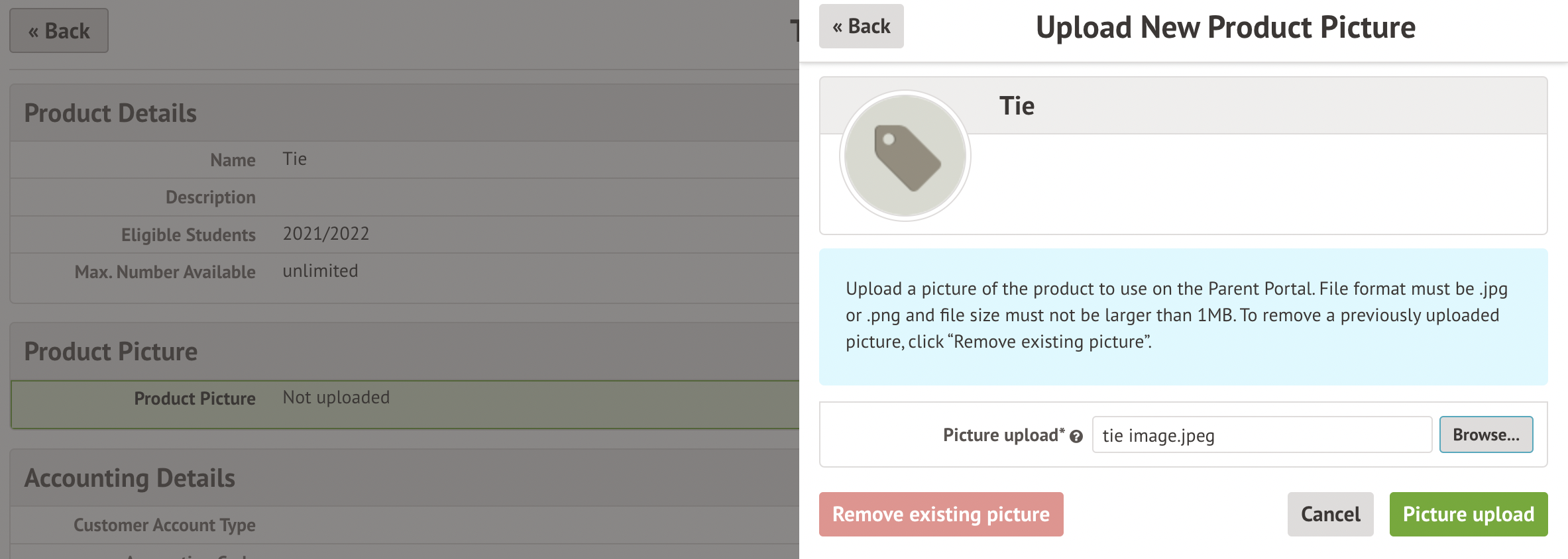 Click into the Product Picture field to add an image. This will show in the parent Portal and Parent App so parents can see what they are purchasing.