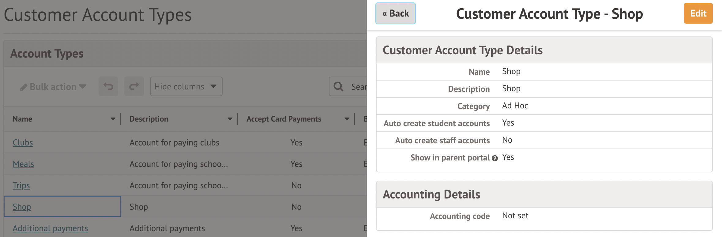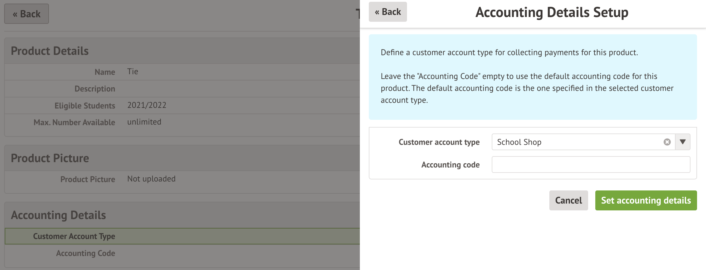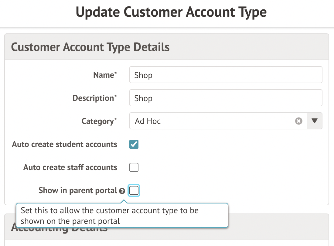 The Accounting Details section allows you to link each School Shop product to a Customer Account Type, to allow products to be grouped together for reporting and reconciliation purposes.