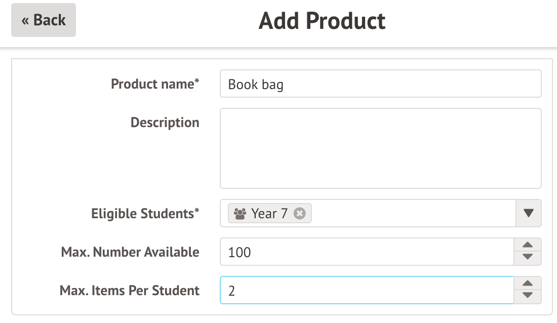 - Add a maximum number of the items available per student, or leave this blank to have unlimited. Once all items have been sold, they can no longer be purchased via the Parent Portal and Parent App, but you can purchase on their behalf manually.