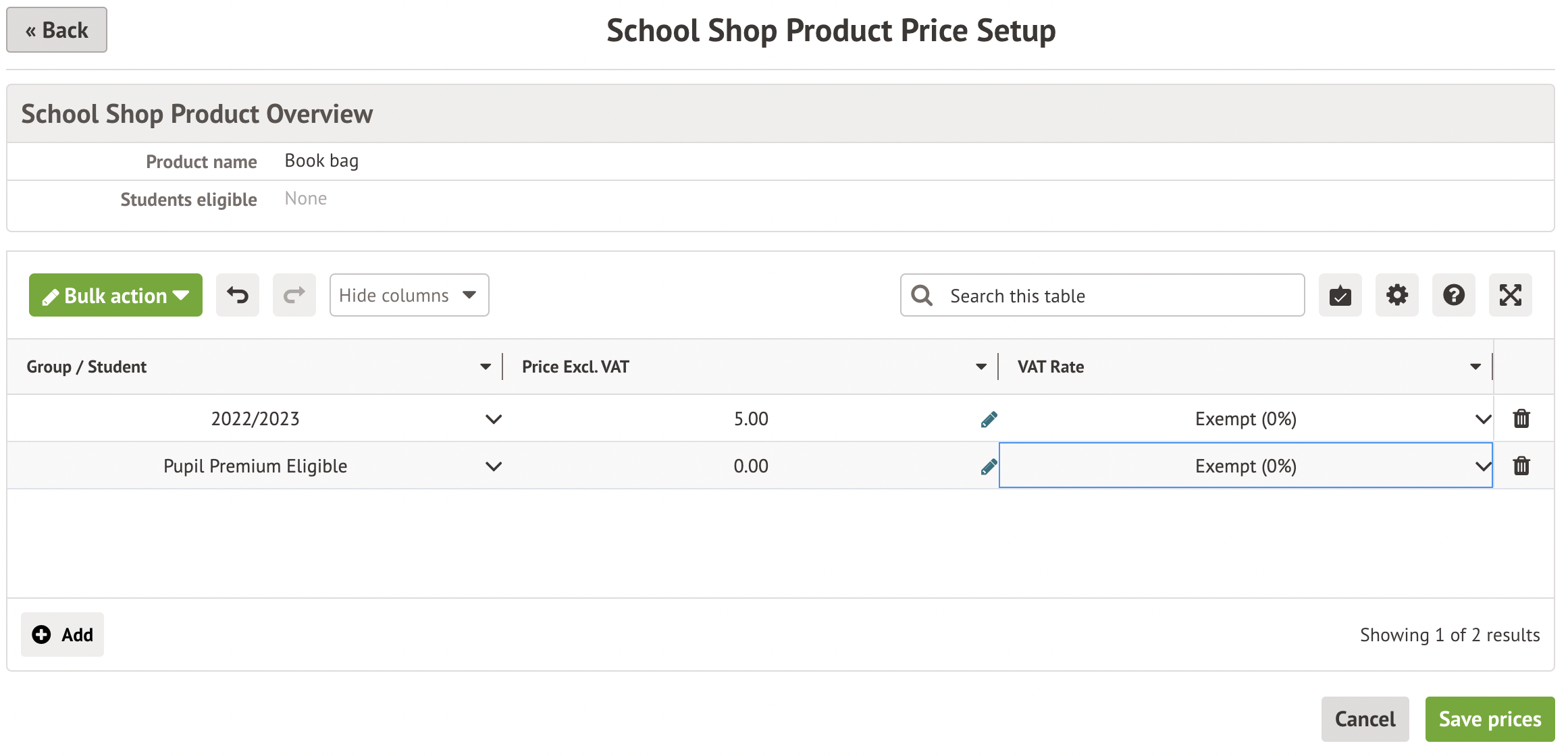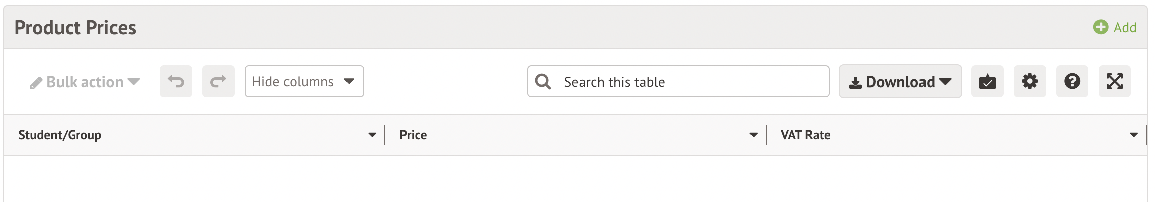The Product Prices section allows you to set different prices for different students or groups of students. Click +Add to add a new price.
