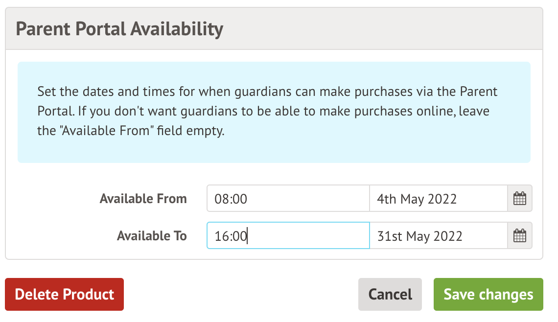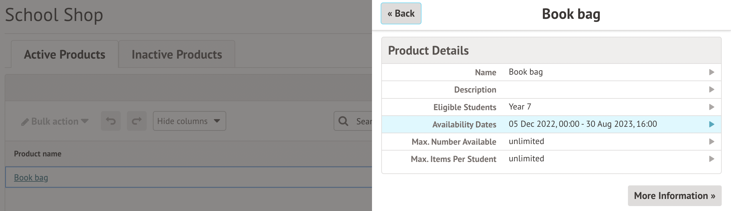 If an item isn't marked as available, it won't be visible on the Parent Portal or Parent App, and will appear in the Inactive Products tab in School > Payments > School Shop > School Shop Products. Select the item, then click on Availability Dates.