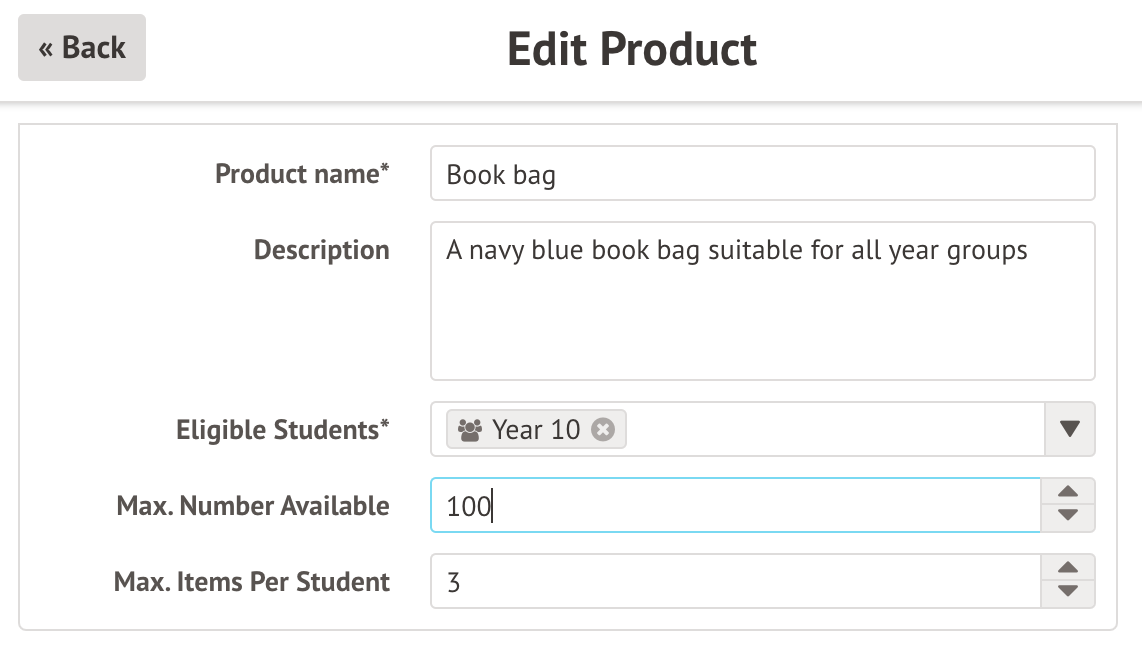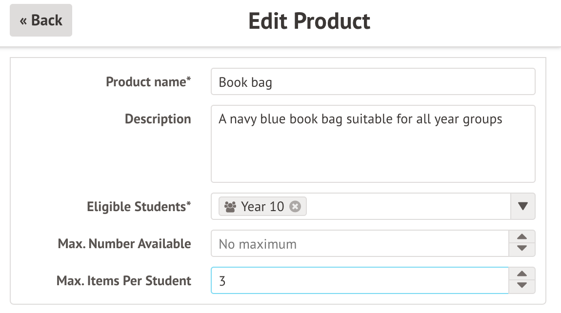 If an item isn't available for a student, it won't be visible on the Parent Portal or Parent App. Go to School > Payments > School Shop > School Shop Products. Select the item, then click on Eligible Students.