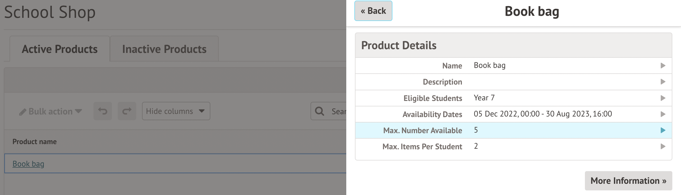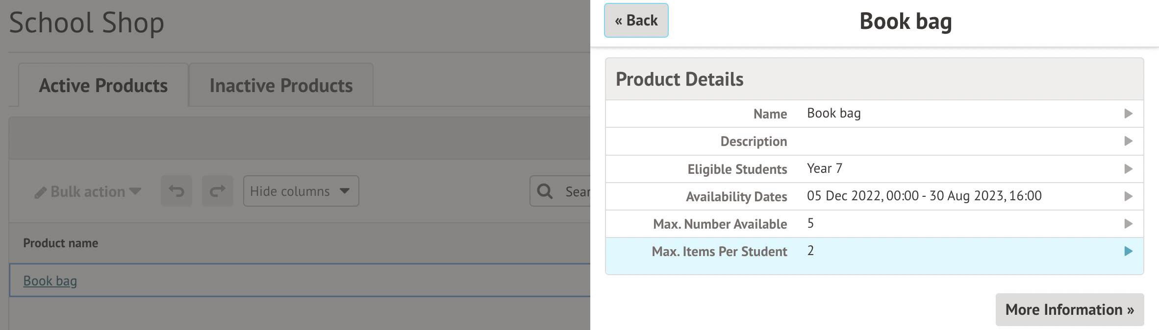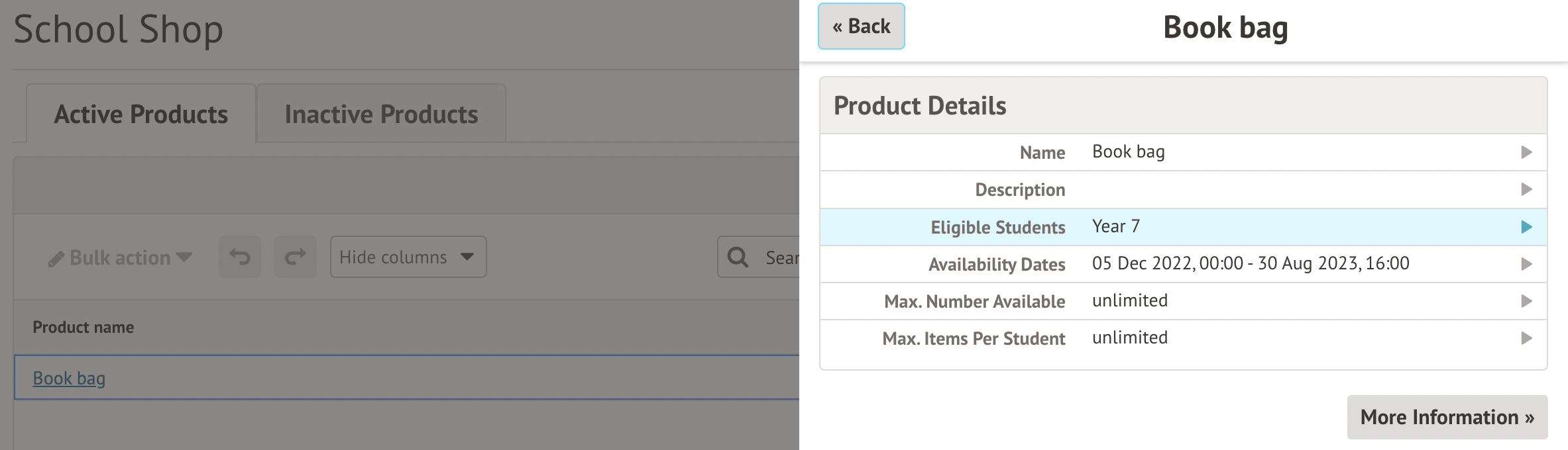 If students aren't covered by a price category, the item won't show on the Parent Portal or Parent App to be purchased. Go to School > Payments > School Shop > School Shop Products, select the item, then click on More information.