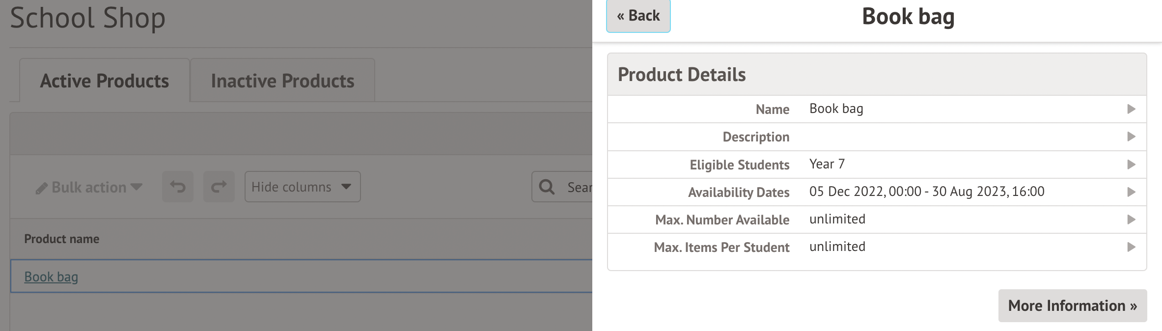 Go to School > Payments > School Shop > School Shop Products, select the item and click More information.