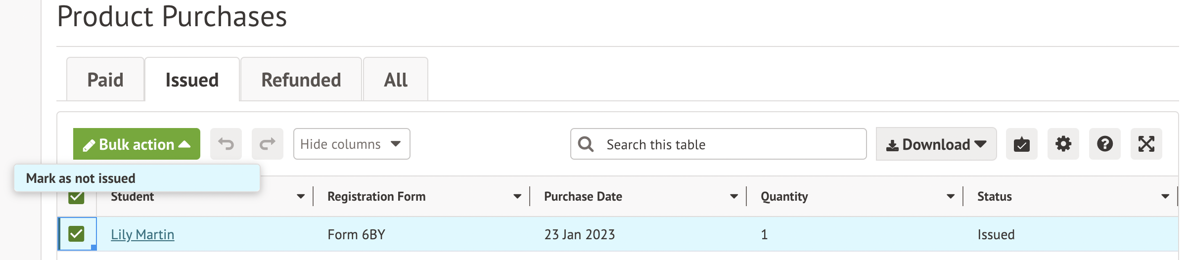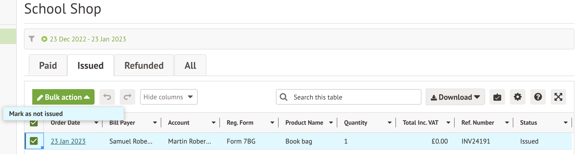 Use the instructions below if you need to refund payments for School Shop items, or mark them as not issued.