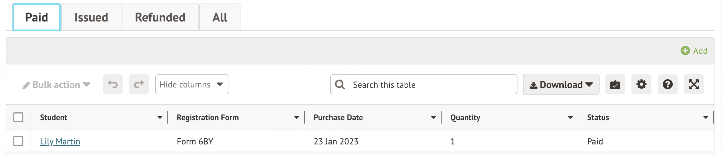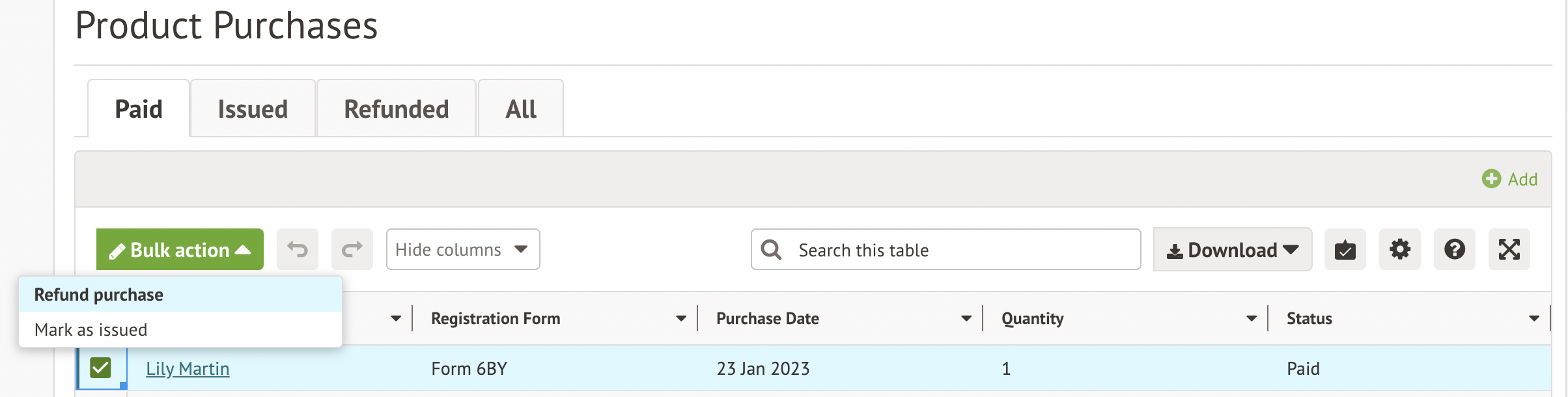 Click into the Paid tab. Tick the boxes next to the students to refund, and click the Bulk action button to select Refund purchase.