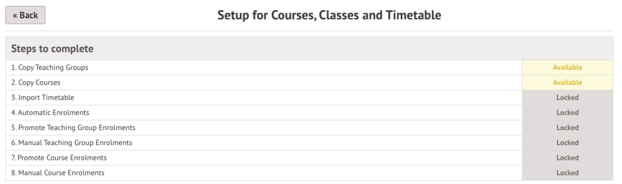 - Complete steps 1 to 8 in order, to copy courses and classes from the previous academic year,then import your timetable, then promote your students - this will copy the course structure from the previous academic year.