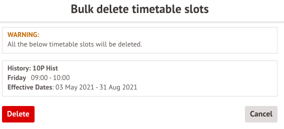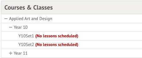 Once the timetable slots have been deleted, wait at least 30 minutes. This is so all lessons in the background will have been deleted. Check there are no lessons scheduled for a few example courses from School > Programmes > Courses.
