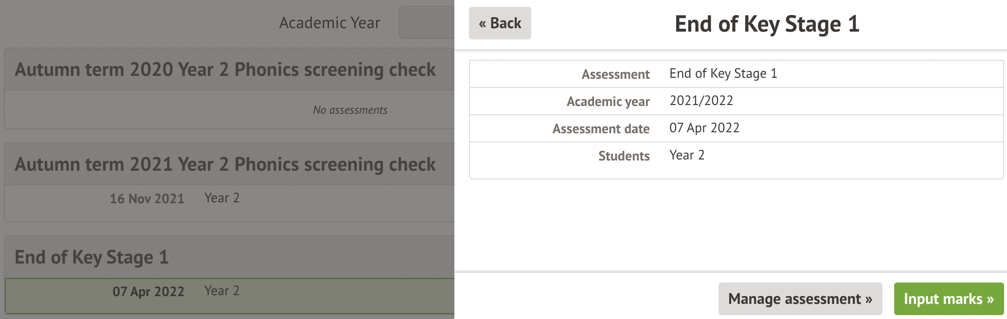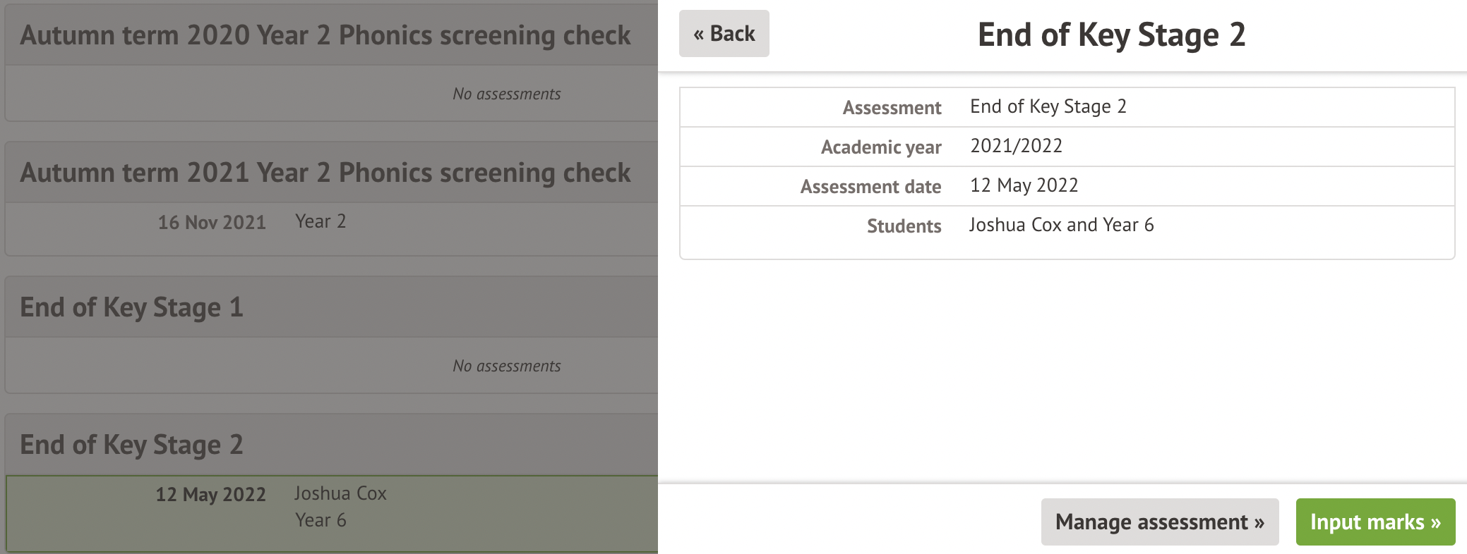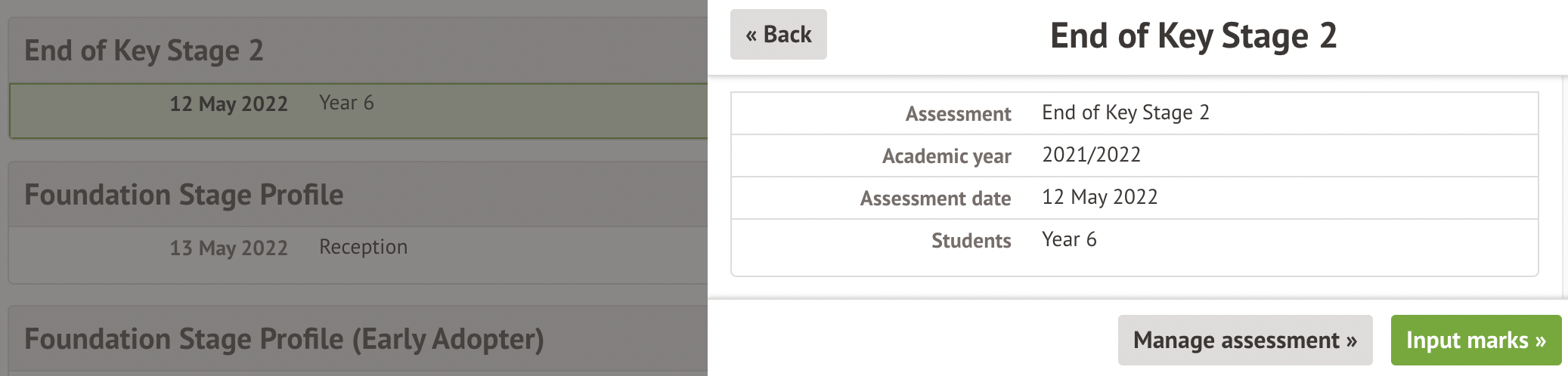 Go to Students > Assessments > DfE Assessments > Mark Entry. Select the assessment, and click Manage Assessment.