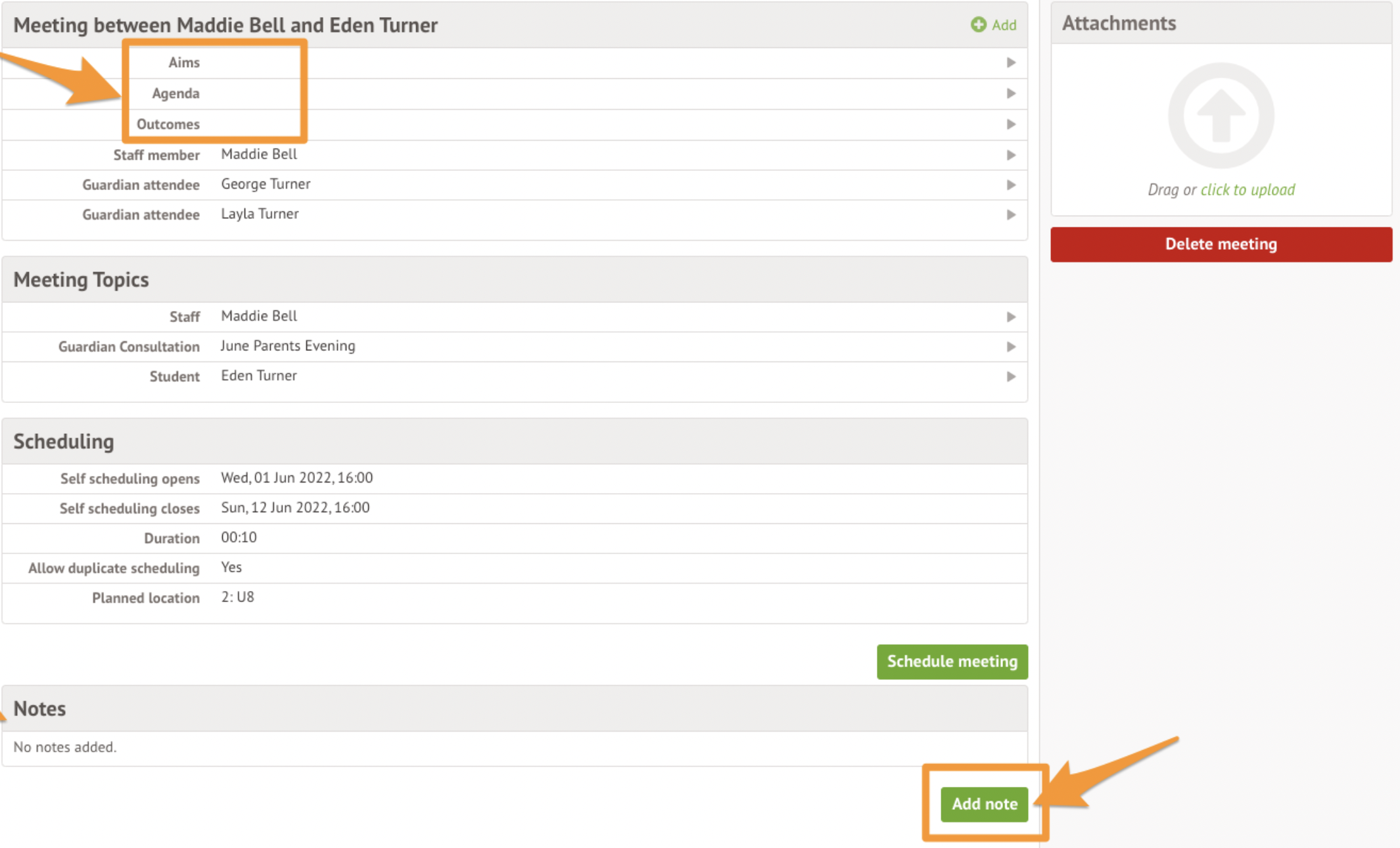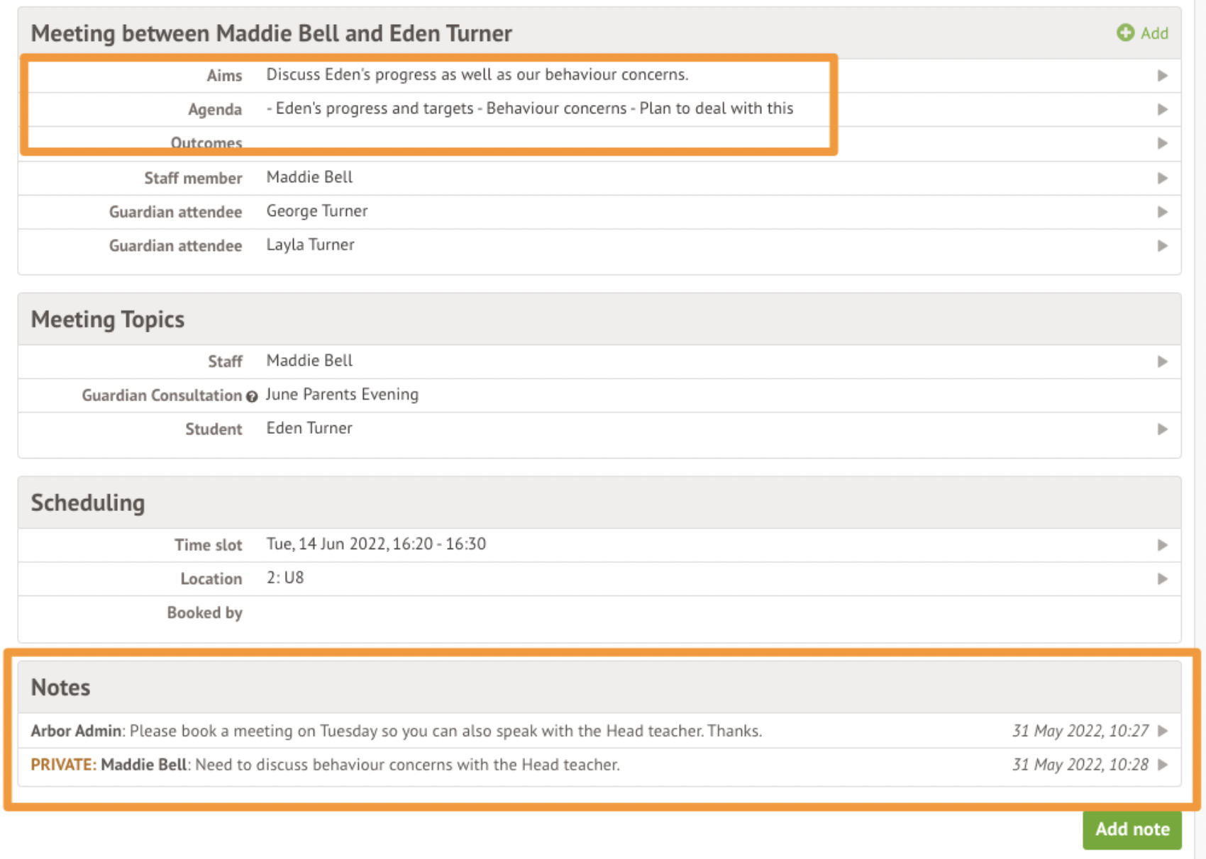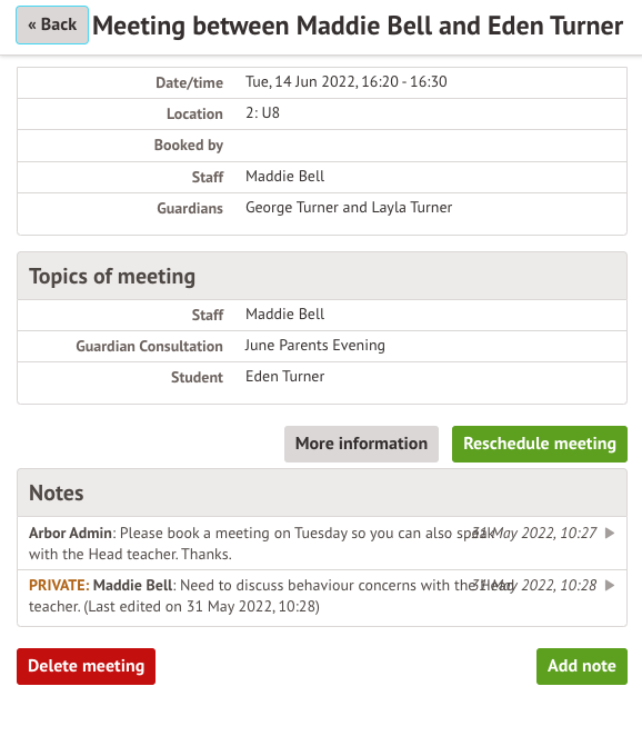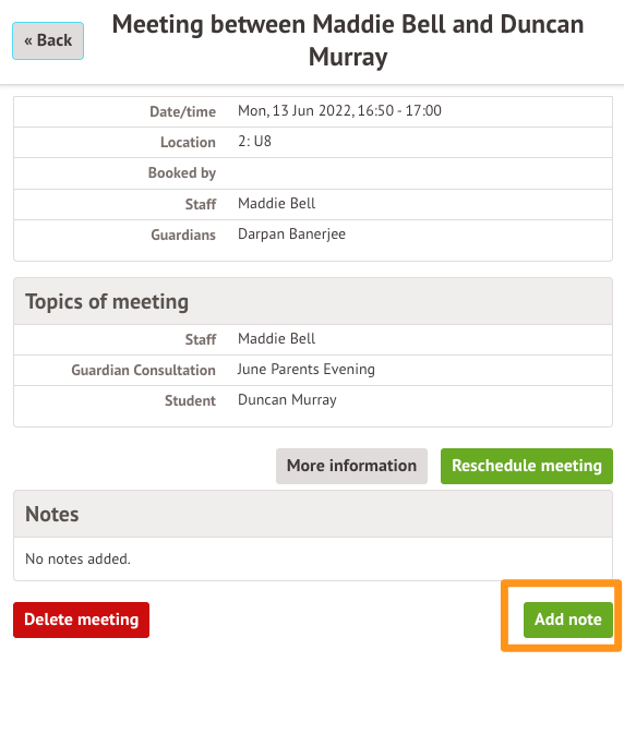 Guardians and staff can add notes to guardian consultation meetings. This can be done for both booked and not yet booked meetings. And can be a private note for the staff or can be shared with the guardian.