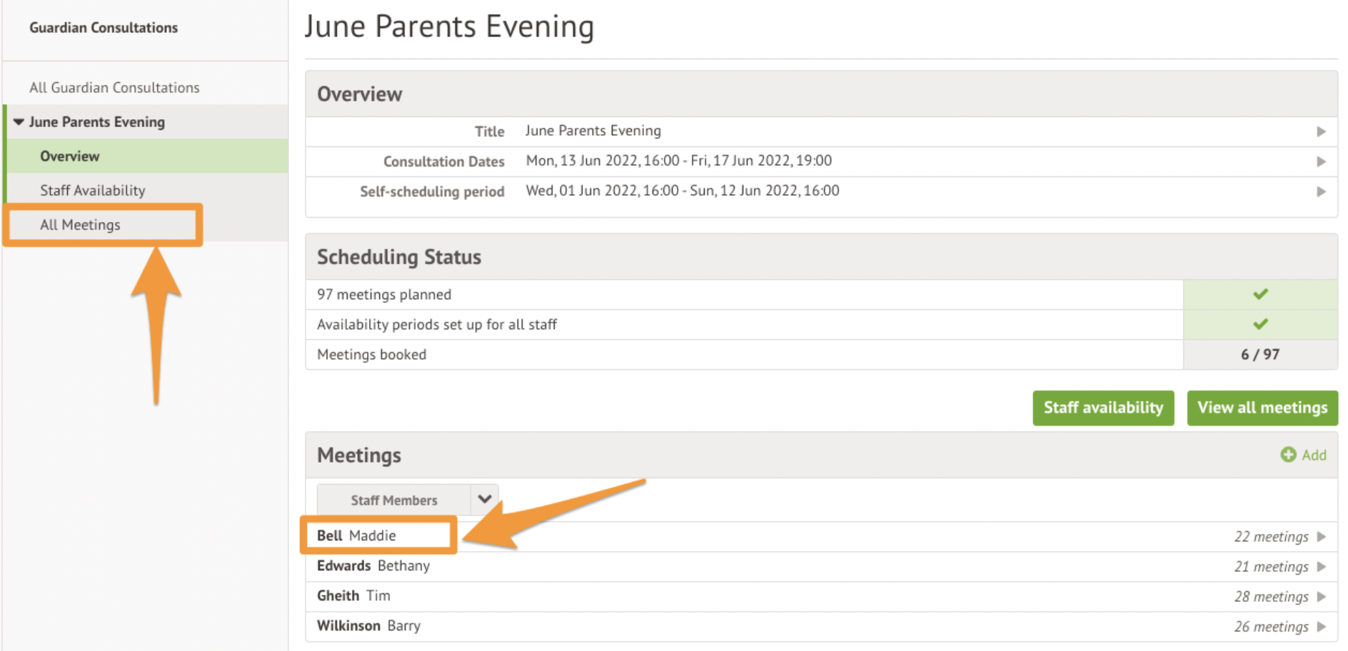 Go to Students > Parents & Guardians > Guardian Consultations and select the consultation. You can then either click into All Meetings or click into a specific staff member to bring up their meetings.