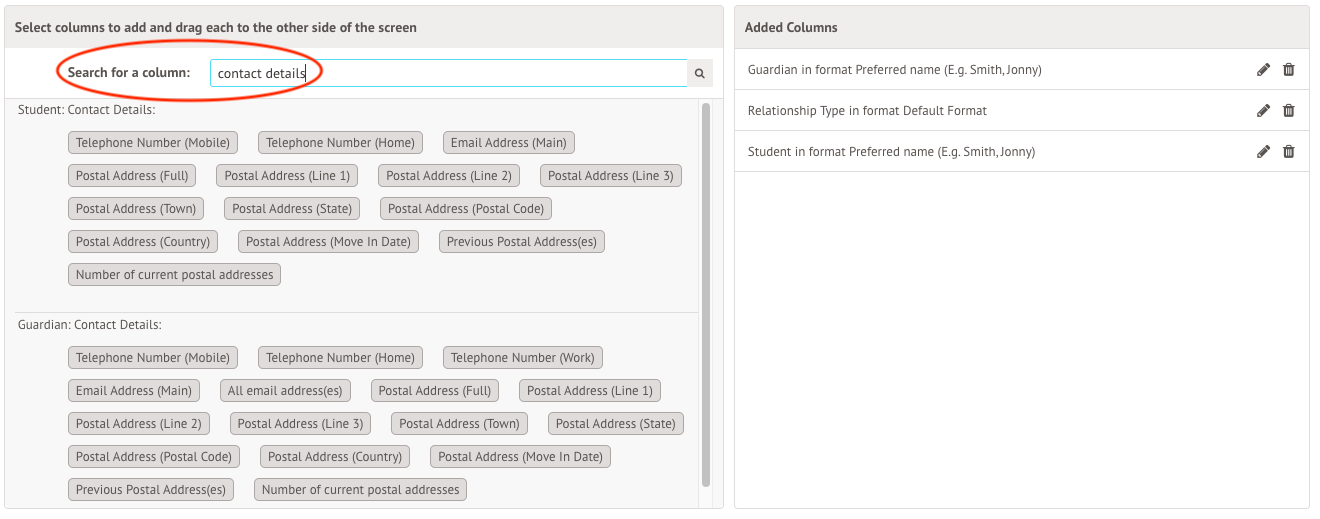 - You can also create a report in the Custom Report Writer about Parents, Guardians and Contacts, and choose which contact information you want to pull via the column selector.