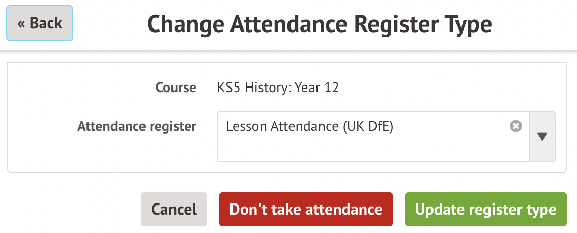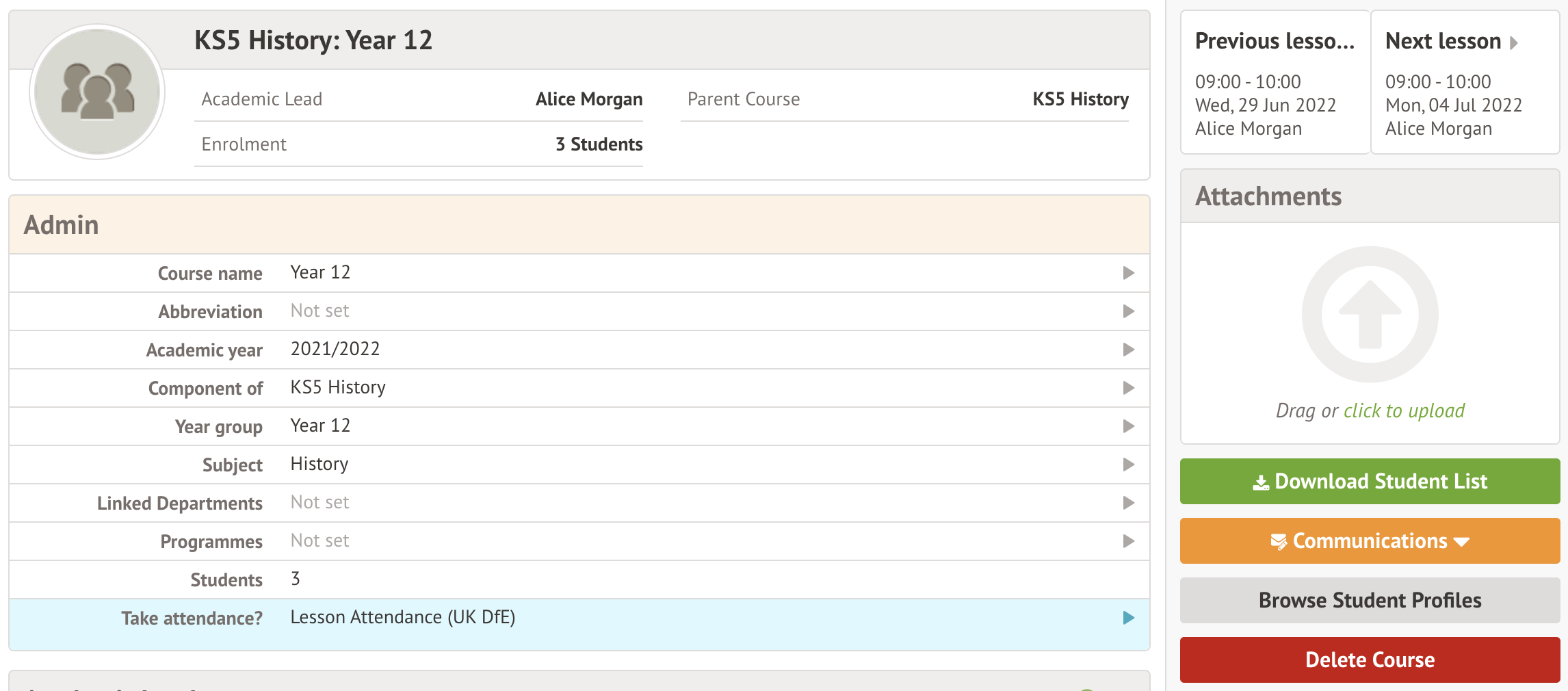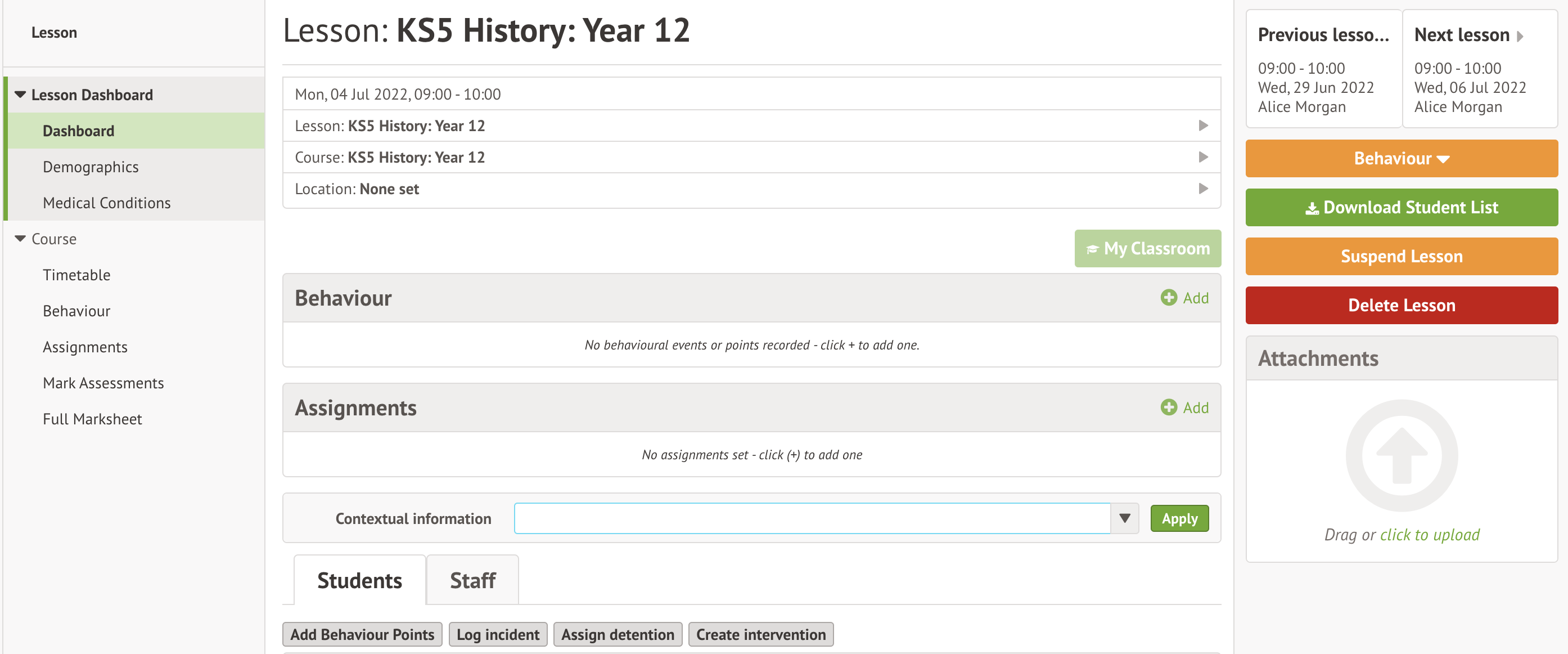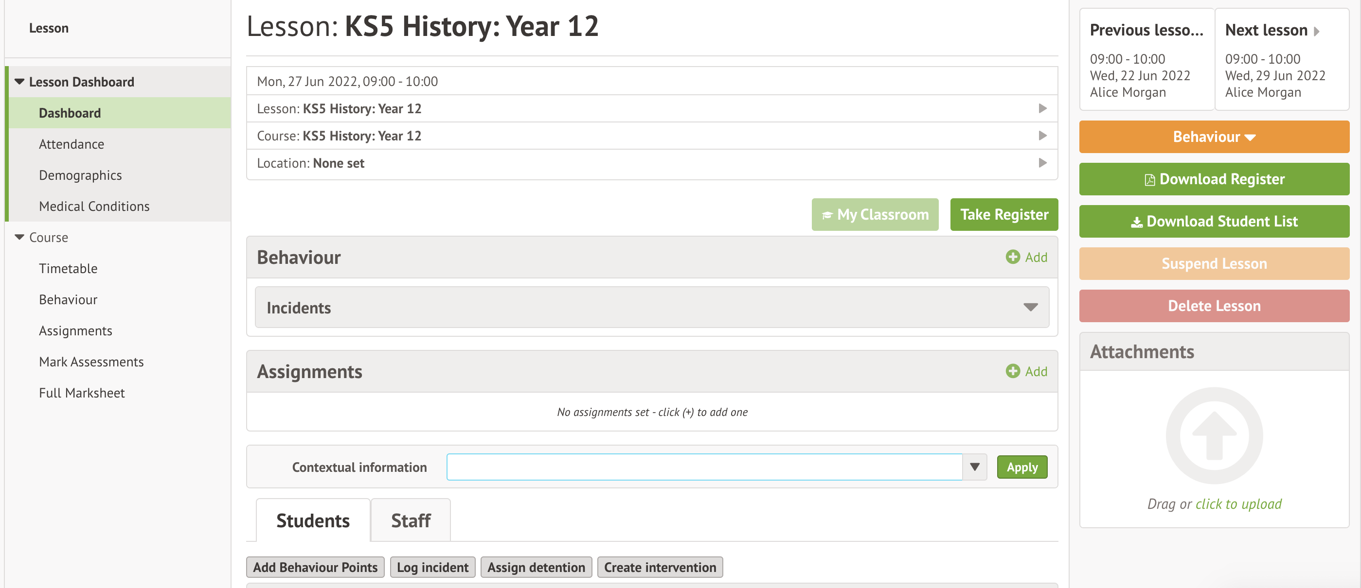 This is what the Lesson Dashboard looks like when attendance taking is disabled. Notice the Take Register button is gone, and you can't access the register from the left-hand menu.