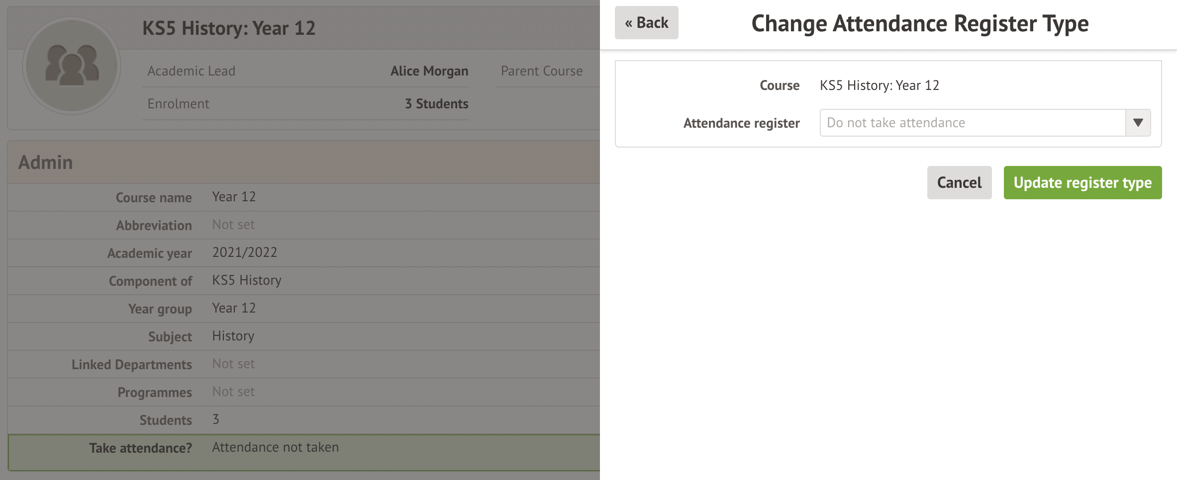 In the slide over, click the Don't take attendance button. This will remove the registers for any future sessions, but won't remove any registers or attendance marks that have already taken place. Please note that clicking Don't Take Attendance in the parent course will not update it for the linked modules. You will need to click this button in all relevant modules for it to take effect.