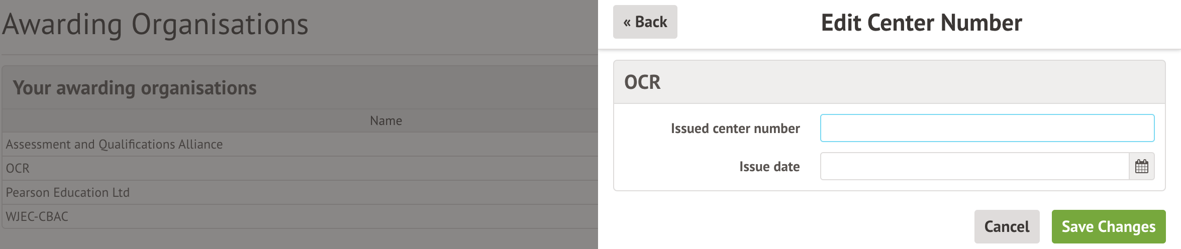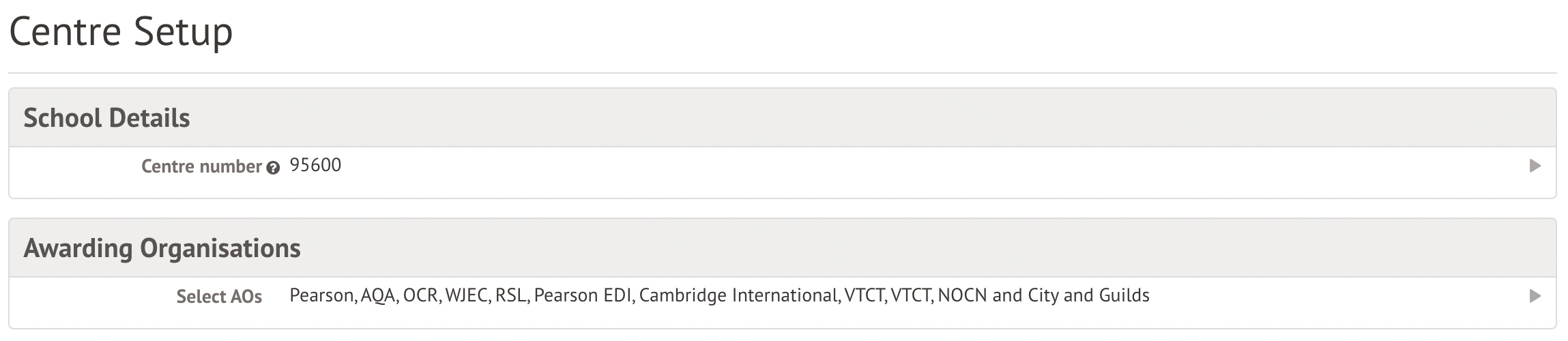 You can record A.O issued centre number. This is sometimes different to the School's overall Centre Number - you can record this by clicking on Awarding Organisations and clicking the field to add the number.