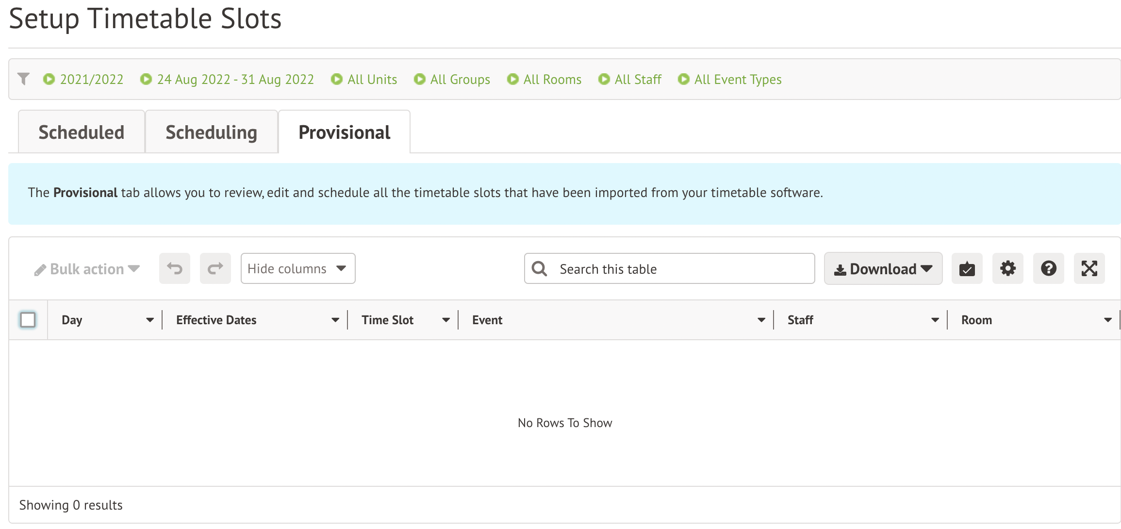- Check your Provisional tab. If there are timetable slots here from your import, make sure to schedule them. Once done, your page will look like the below screenshot.