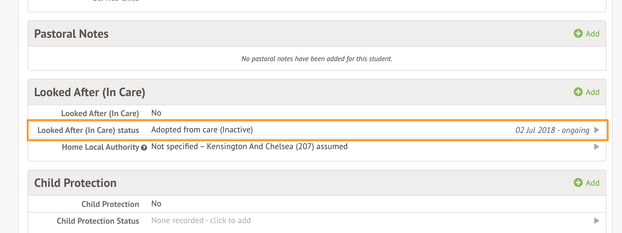In order to resolve this, head to the student's profile, and scroll down to the Looked After (In Care) section. You should see the Looked After (In Care) status is set as "Adopted from care (Inactive)".
