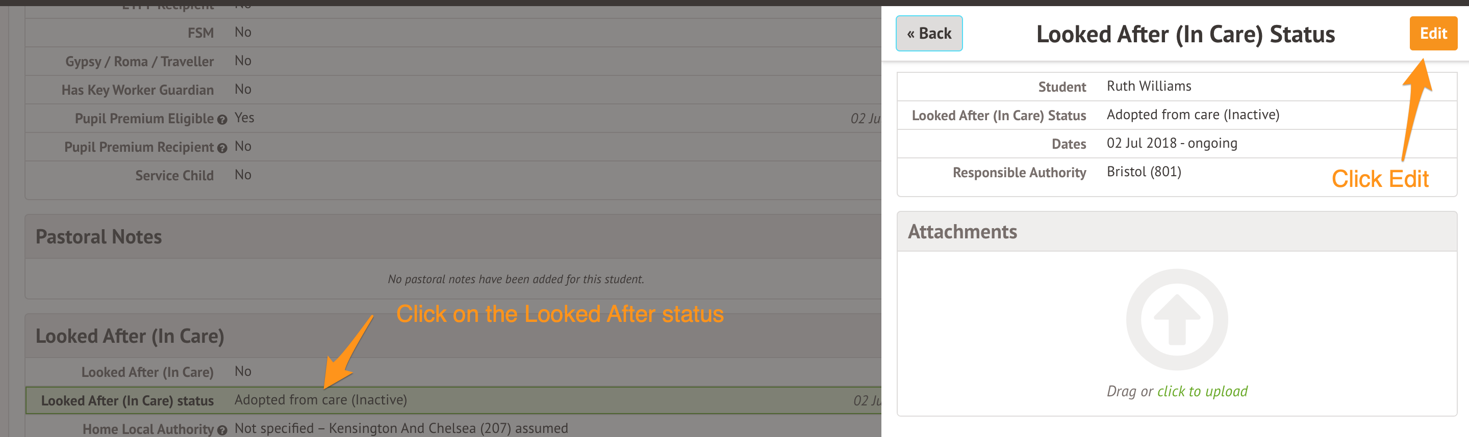 Click on the Looked After (In Care) status field, then click Edit on the slideover that appears.