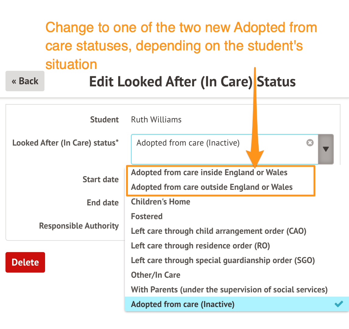 You'll need to change the selected value to either "Adopted from care inside England or Wales" or "Adopted from care outside England or Wales", depending on the student's circumstances, then click Save Changes.