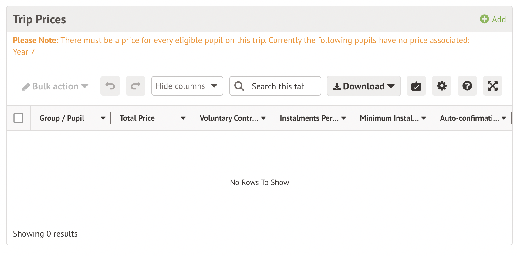 If there are now missing prices for some groups of students, you'll no longer see the Trip Participants section. Please note that the invoices and payment details for students already booked on will still be there in the background, and accessible from the student profiles or Payments area.