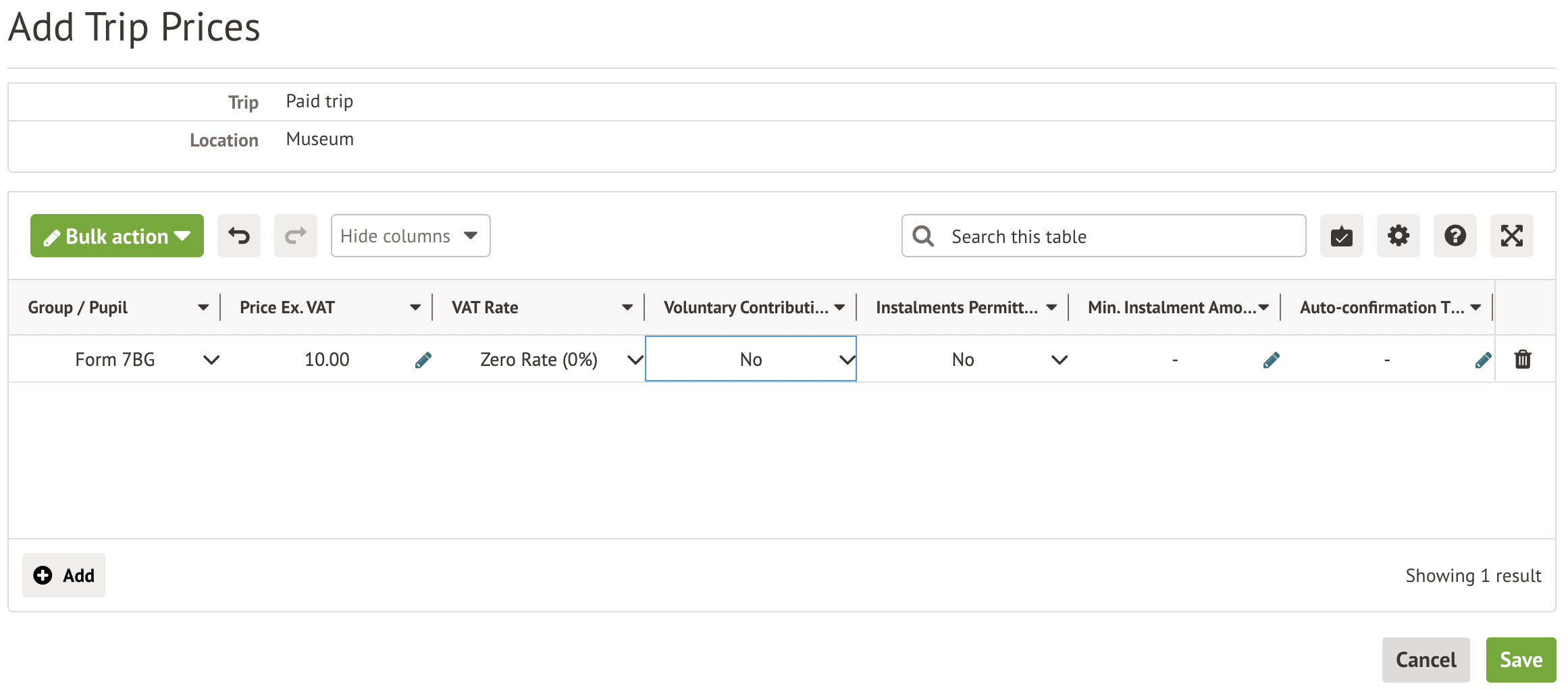 In the Trip Prices section, click +Add to add an additional price for a different groups of students, or click on the existing price to edit it.