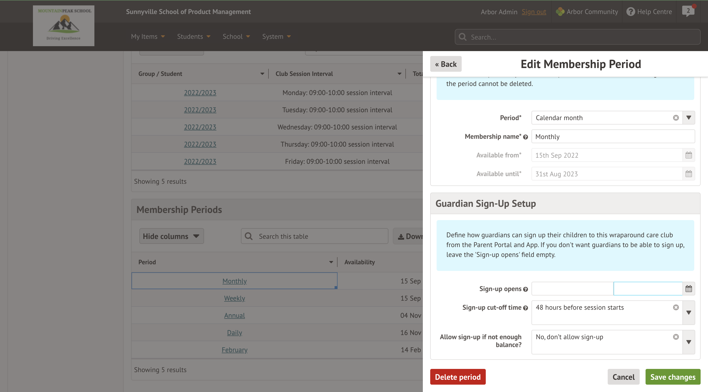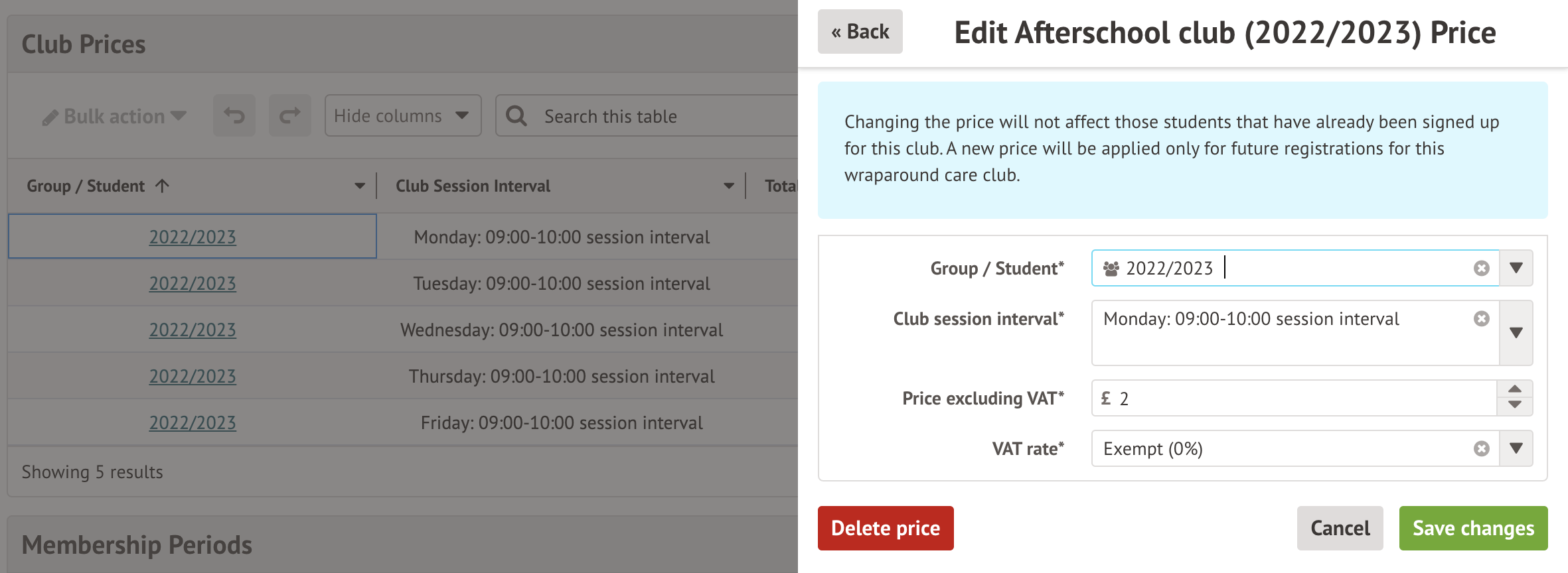 You will need to add a new membership period to cover the remaining length of time until the end of term to make sure that parents can still book at the current price until the holidays start. - Set the new membership period to be available from now until your last day of term