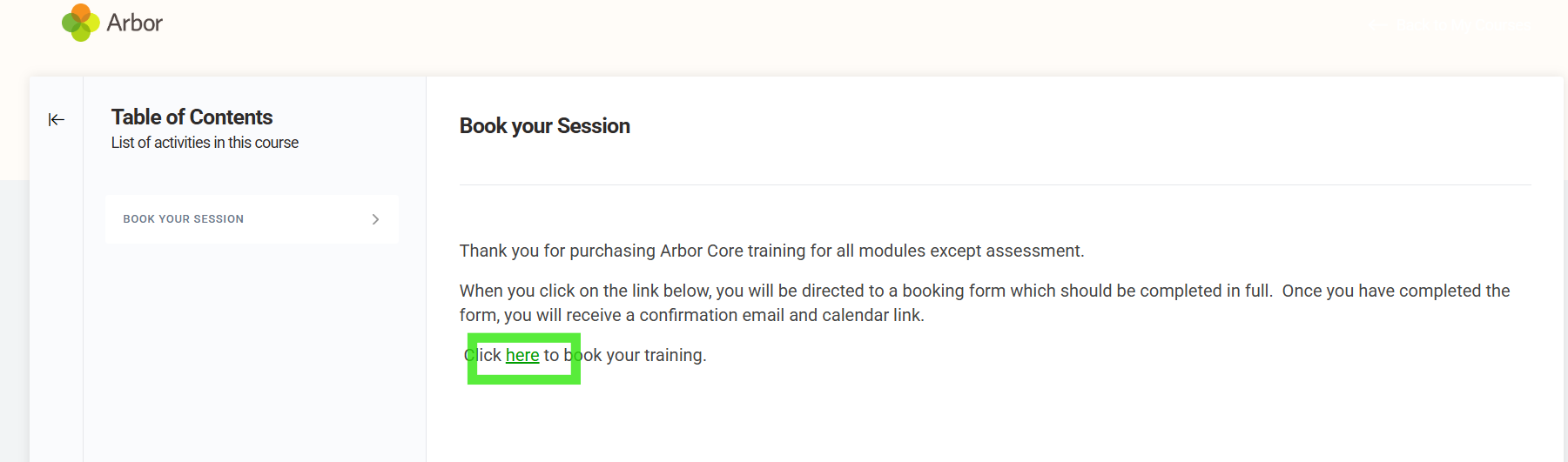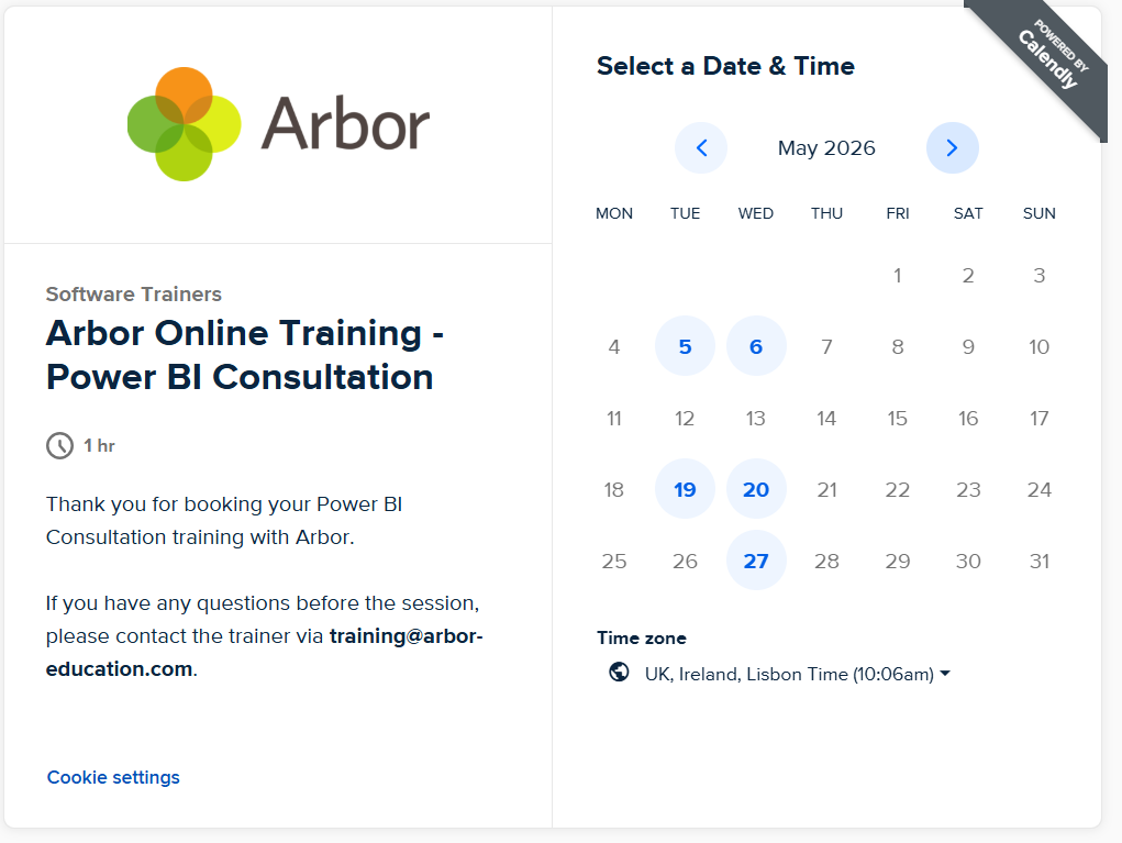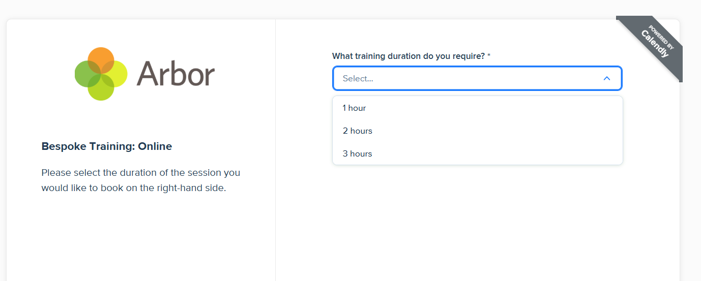 If you have purchased Bespoke Online trainnig this can be used to book 1-1 training on any Arbor feature except Assessments.
