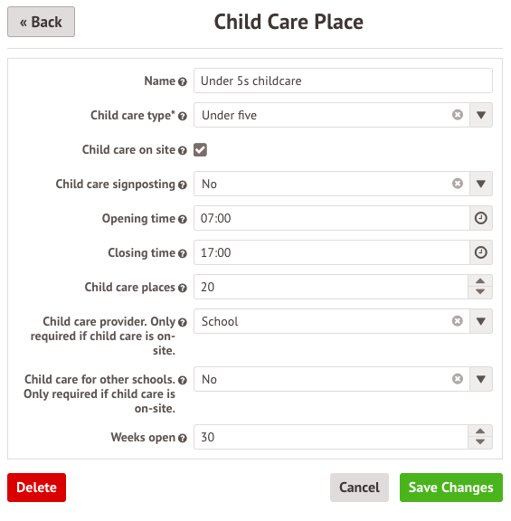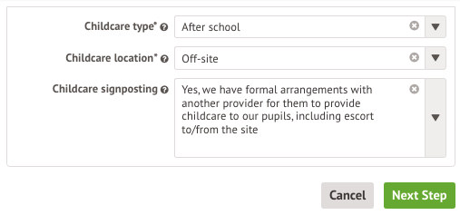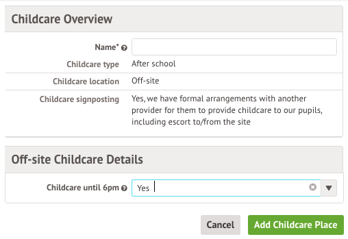 In the Spring Census, your school is required to provide information on the number and type of childcare places your school provides. You must input this information into your site, even if you don't offer this type of childcare or any childcare.