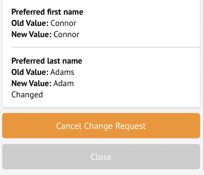If your school must accept record changes, the changes will show as Pending. Until the details are accepted, you can click into the change and cancel the change using the orange button.