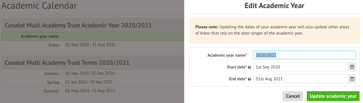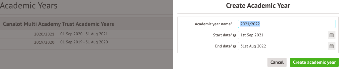 Please note: You cannot delete an academic year once added, but you can click it to edit the dates. The end date must not overlap with the start date of the next year.