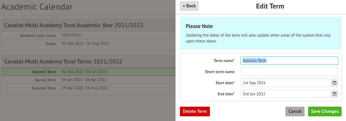 If you want to amend the dates or delete a term, click into the term and click Edit.