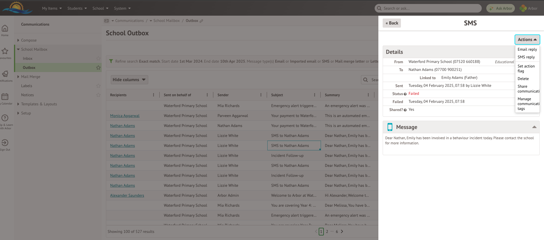 Please note: Communications set to Shared = No that are sent by individual users (not the school) will only appear in the School Mailbox of the staff member who sent them. To view these communications otherwise, you will need to click the grey Download Communication Log button.