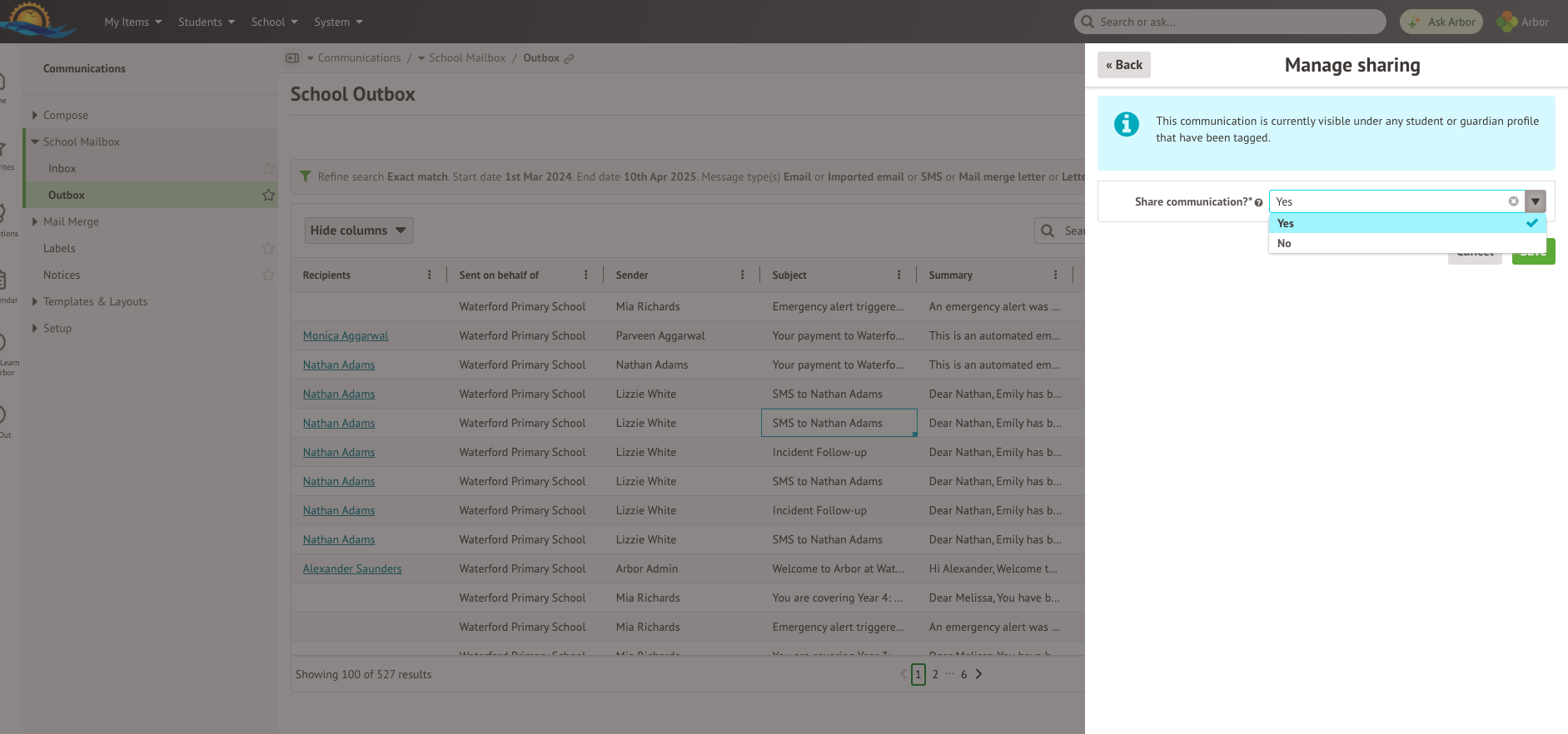 Communications that were sent by the school and have been marked as Shared = No can only be viewed from the All School Communications > School Mailbox log.