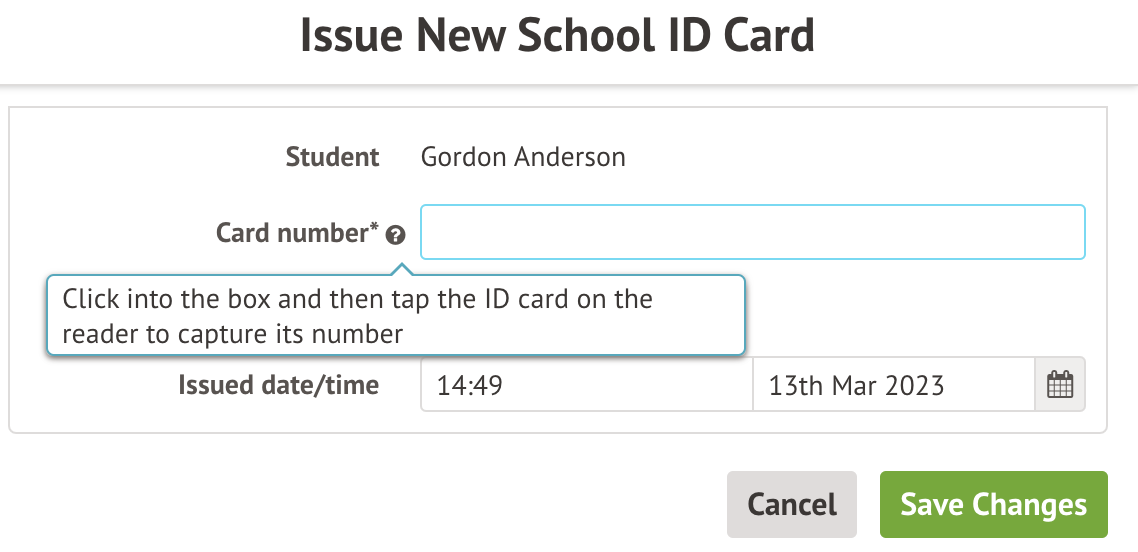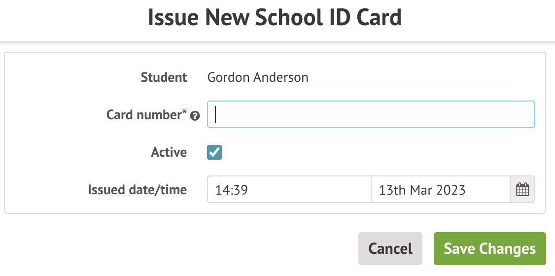 Add the number, choose whether the card is currently active, and add the date and time when the ID was issued.